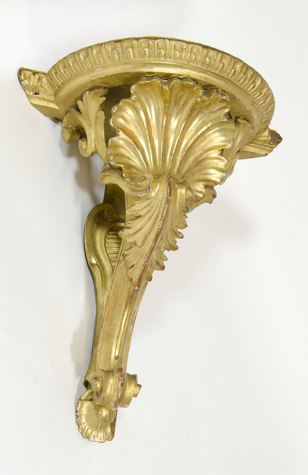 Mensola ad angolo in legno dorato scolpito. XIX secolo. H. cm. 52.