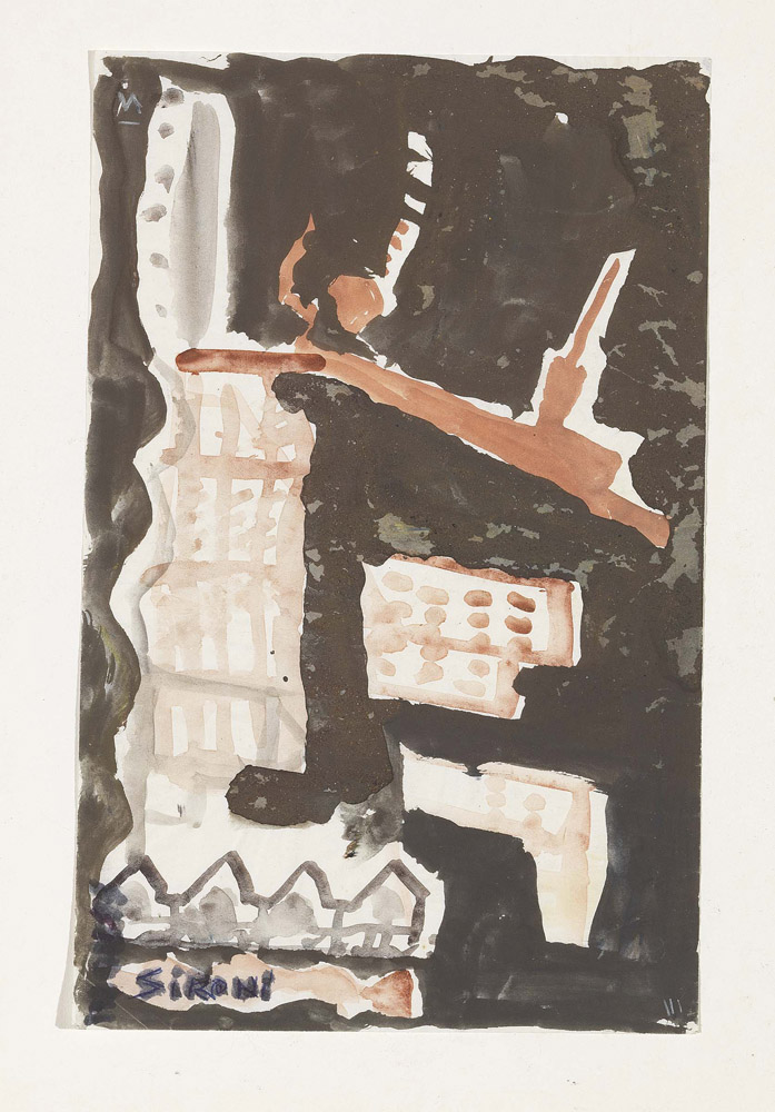 Mario Sironi, Sassari 1885 - Milano 1961, Composizione, Tempera su carta, cm. 22x14, Firma in basso a sinistra: Sironi