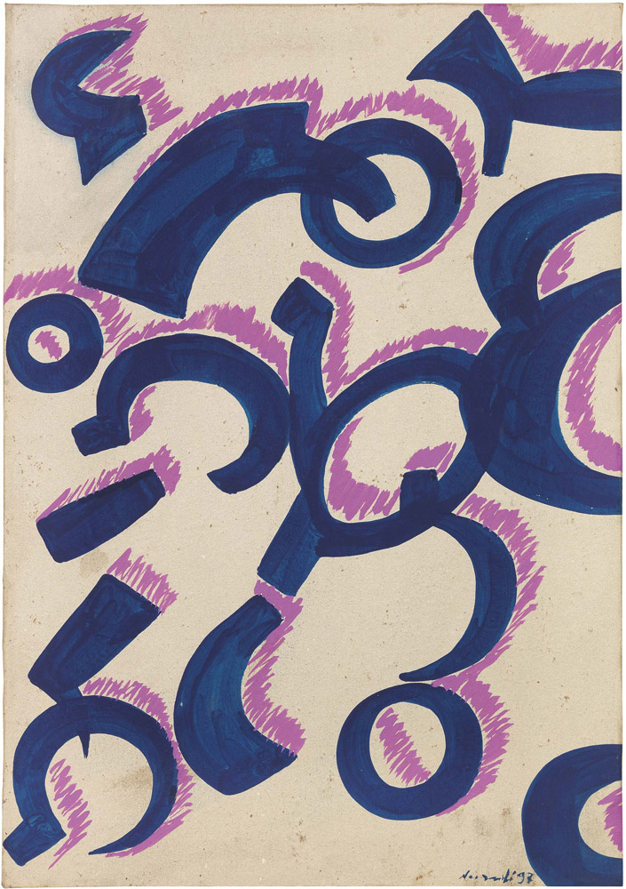 Carla Accardi, Trapani 1924 - Roma 2014, Blu lilla, 1997, Tecnica mista su carta, cm. 70x49, Firma e data in basso a destra: Accardi 97., Foto autenticata dall'artista, Roma, 10/03/98 con timbro Studio Accardi, Roma, con n. 57/98
