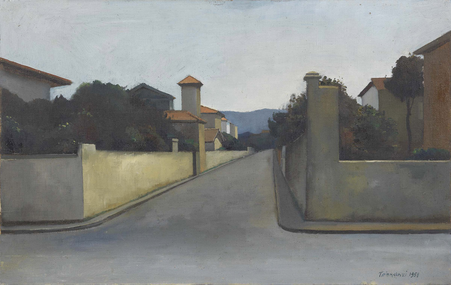 Nino Tirinnanzi, Greve in Chianti (Fi) 1923 - Firenze 2003, Paesaggio, 1958, Olio su tela, cm. 60x95, Firma e data in basso a destra: Tirinnanzi 1958