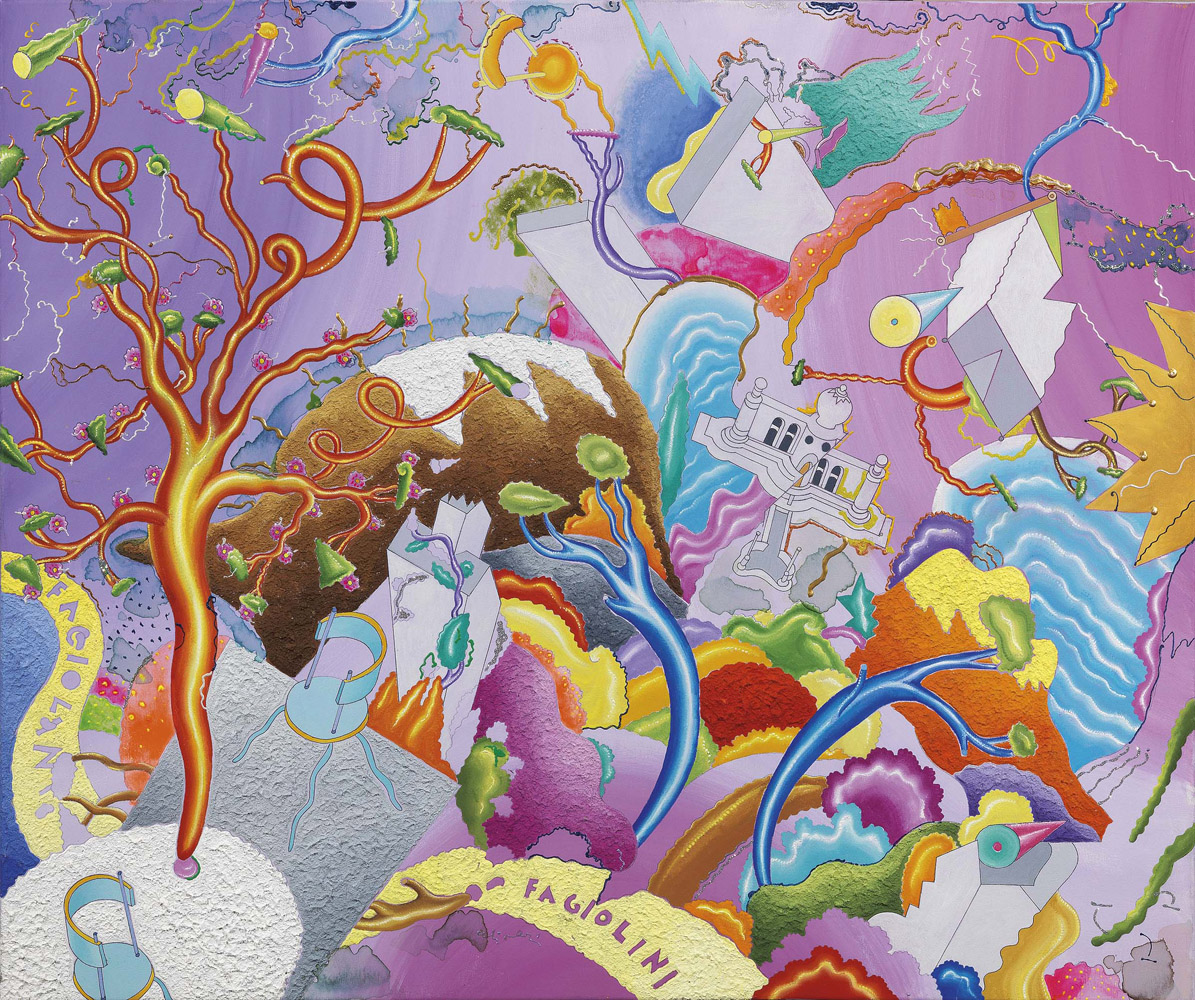 Luca Alinari, Firenze 1943, Sulla strada dei fagiolini, 1997, Tecnica mista su tela, cm. 100x120, Firma in basso al centro: Alinari; titolo al verso sulla tela: Sulla strada dei fagiolini; firma e data sul telaio: Alinari / 97