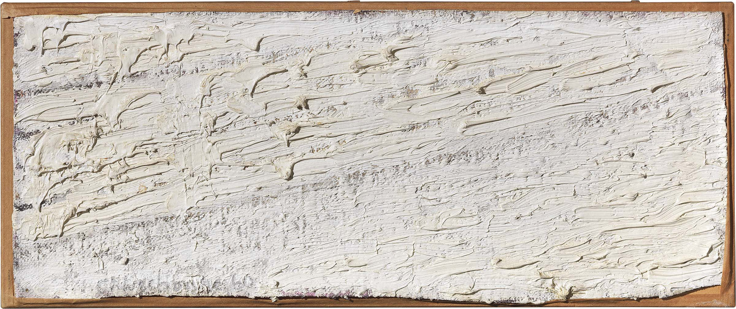 Serge Charchoune, Bougourouslan 1888 - Villeneuve-Saint-Georges 1975, Monochrome blanche, 1960, Olio su tela applicata su tavola, cm. 12x29,6, Firma e data in basso a sinistra: Charchoune 60., Storia: Collezione Jean Claude Abreu, Parigi; Collezione privata, Certificato su foto di Pierre Guenegan, Parigi, 17 febbraio 2011, con n. 246/2011 e indicazione di pubblicazione all'interno del quarto volume del catalogo ragionato del maestro