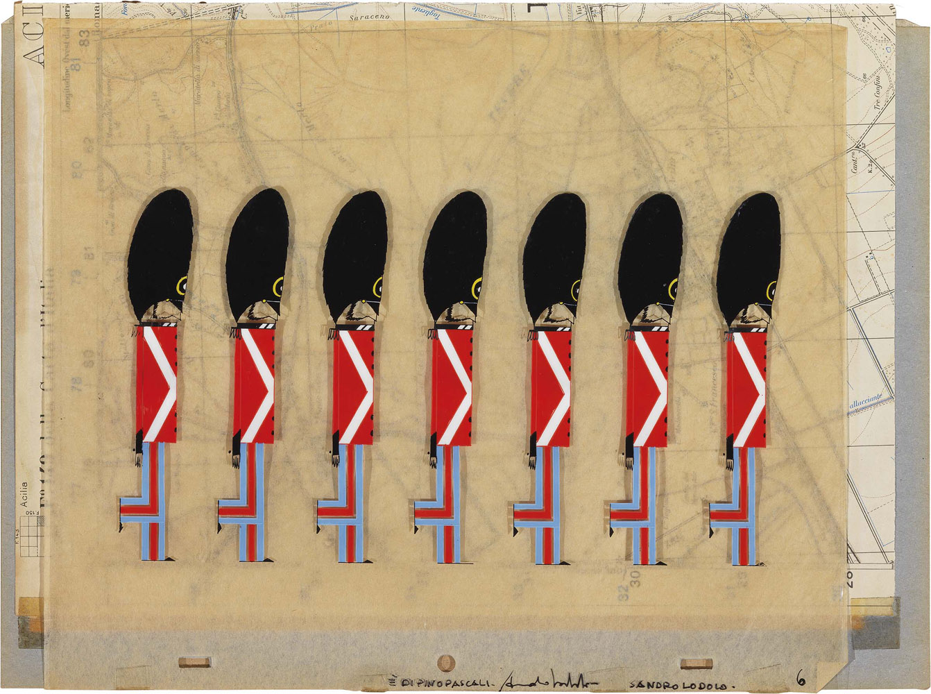 Pino Pascali, Bari 1935 - Roma 1968, Pronti... Fuoco!, 1963, Tecnica mista su carta topografica e acetato, cm. 23x32, Dichiarazione di autenticità in basso a destra: È di Pino Pascali Sandro Lodolo., Certificato su foto di Sandro Lodolo., Filmato per la pubblicità cinematografica delle sigarette "Amadis"
