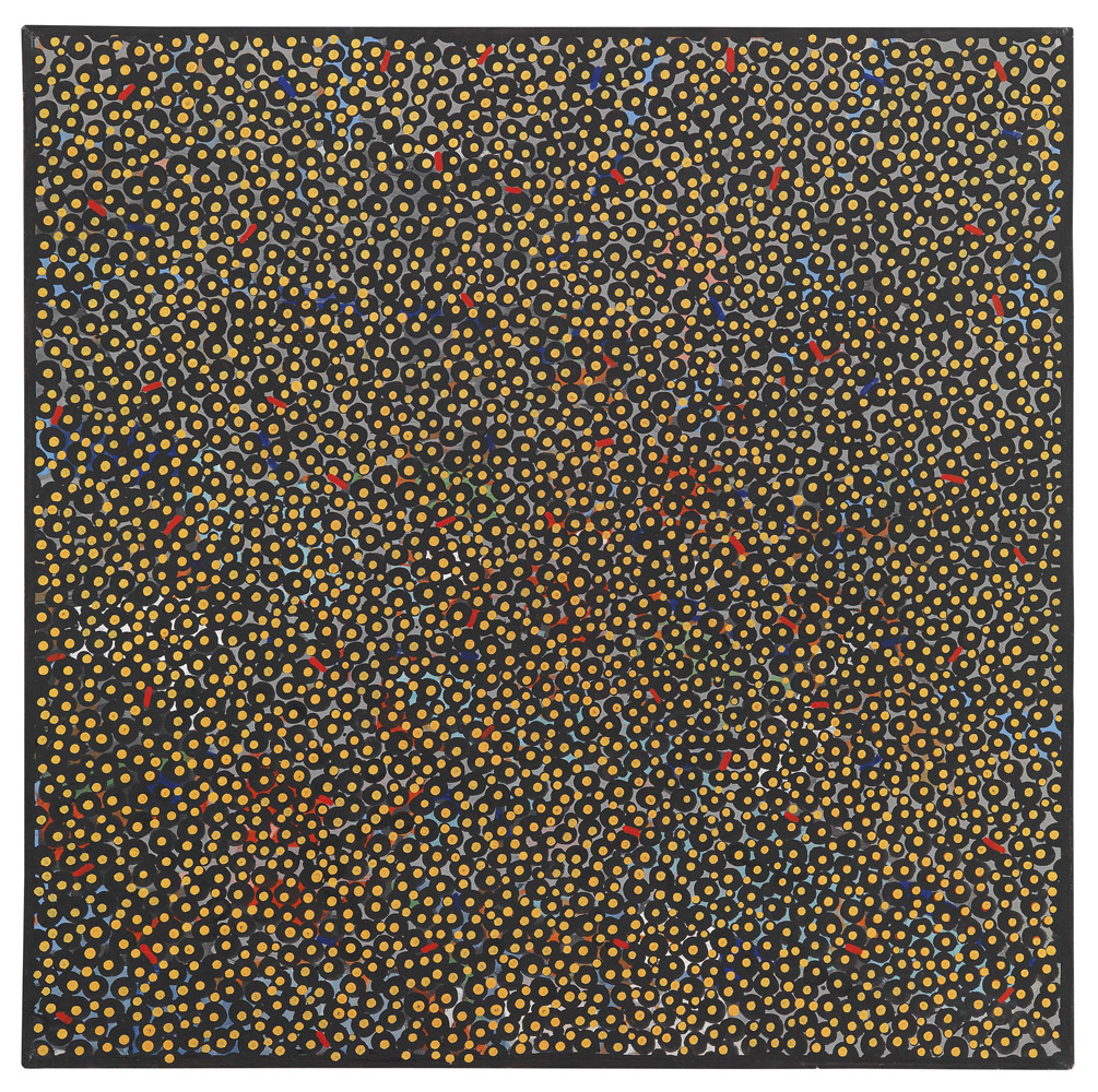 Gastone Biggi, Roma 1925 - Langhirano (Pr) 2014, Costellazione della luce padana, 1993, Tempera su tela, cm. 100x100, Numero d'archivio, titolo, firma e data al verso sulla tela: 1790 / "C. della luce padana" / Biggi 93., Storia: Centro Steccata, Parma; Collezione privata, Certificato su foto Galleria Centro Steccata, Parma; opera registrata presso l'Archivio Gastone Biggi al n. 1790