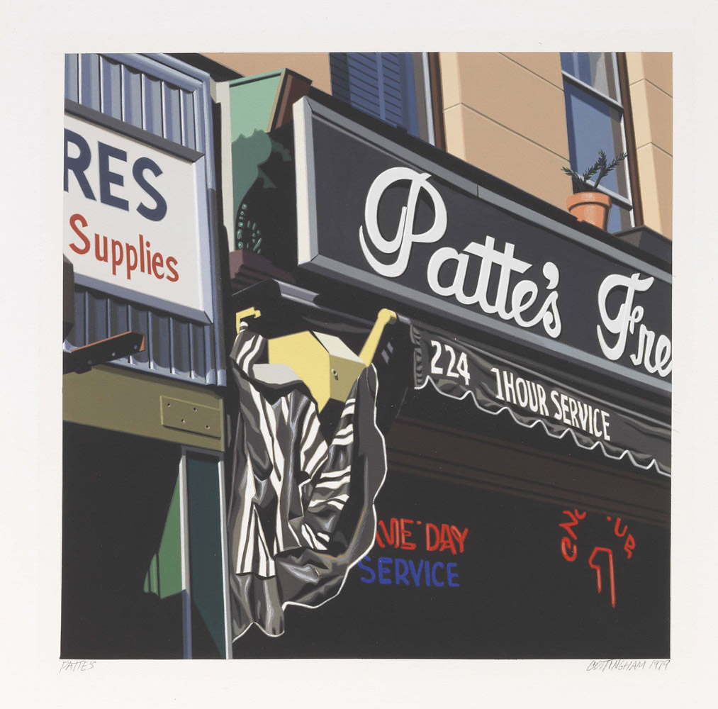 Robert Cottingham, Brooklyn 1935, Patte's, 1979, Acrilico su carta, cm. 26,7x26,7 (riquadro), cm. 43,8x43,8 (foglio), Firma e data in basso a destra: Cottingham 1979, titolo in basso a sinistra: Patte's