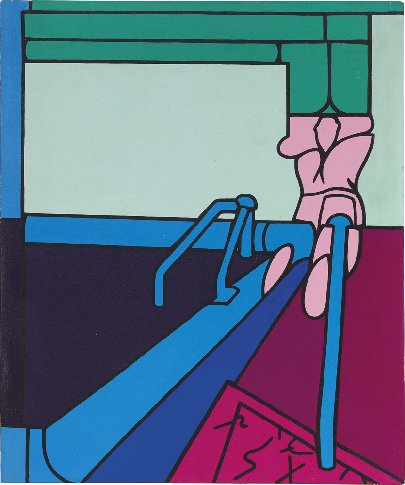 Valerio Adami, Bologna 1935, Bagno turco, 1969, Olio su tela, cm. 60x50, Firma, titolo e data al verso sulla tela: Adami / Bagno turco / 26.11.69 / 29.11.69: etichetta con n. 221974 e timbro Galleria d'Arte Boccioni, Milano: timbro F.lli Orler, Favaro Veneto, con n. 48; sul telaio: etichetta Galleria Schwarz, Milano, con n. 4010., Foto autenticata dall'artista