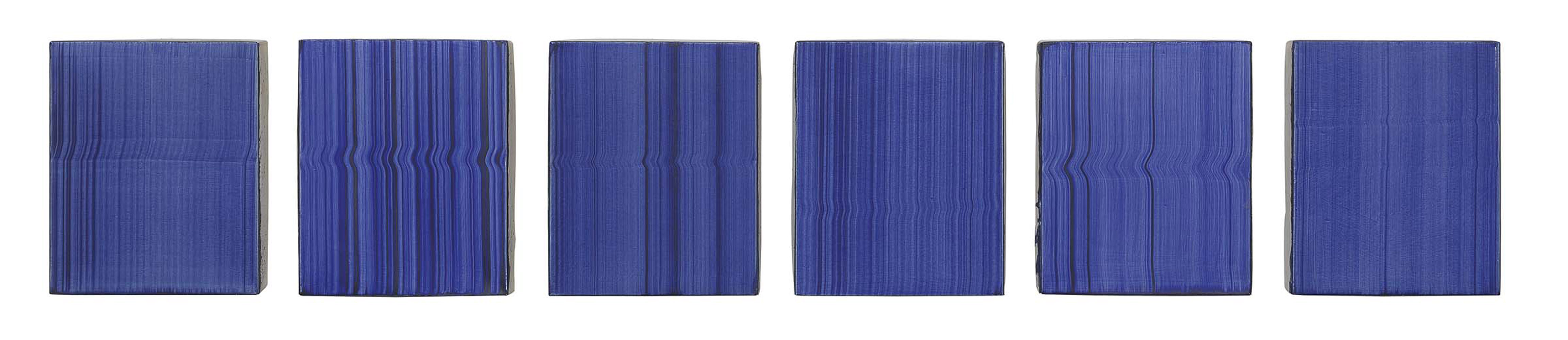 Jason Martin, Jersey 1970, Senza titolo (Trevalley I-VI), 1995, Pigmento blu su tela, sei elementi, cm. 30,5x25,5 ca. ognuno, Firma, data e numero progressivo al verso di ogni elemento, sul risvolto della tela: Jason Martin / Feb '95 / 1-6., Storia: Lisson Gallery, Londra; Collezione Israel Phoenix Assurance Company; Collezione privata
