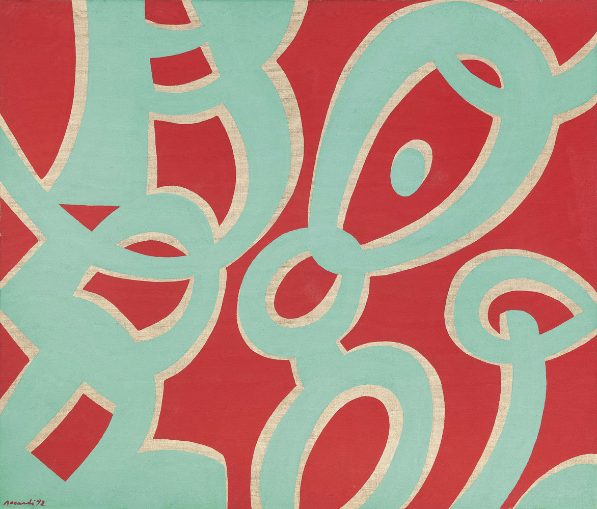 Carla Accardi, Trapani 1924 - Roma 2014, Verderossorubino, 1992, Vinilico su tela grezza, cm. 90x105,2, Firma e data in basso a sinistra: Accardi 92; firma, titolo, data e numero d'archivio al verso sul risvolto della tela: Accardi - Verderossorubino - 1992 - n. 260A., Foto autenticata dall'artista su certificato Studio Accardi, Roma, 20/02/02, con n. 15/02, arch. n. 260A., Bibliografia: Germano Celant, Carla Accardi. La vita delle forme. The life of forms, Silvana Editoriale, Milano, 2011, p. 391, n. 1992 51
