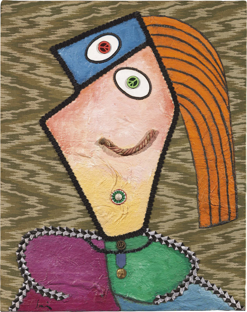 Enrico Baj, Milano 1924 - Vergiate (Va) 2003, Visage de femme couchée, 1969, Acrilico, collage, ovatta, passamaneria, decorazioni e oggetti su tela, cm. 92,2x73,2, Firma in basso a sinistra: Baj; titolo al verso sul telaio: Visage de femme couchée: etichetta Studio Marconi / Milano: etichetta Bluart / Galleria d'Arte Moderna e Contemporanea / Padova., Storia: Studio Marconi, Milano; Collezione privata, Bibliografia: Enrico Crispolti, Catalogo generale Bolaffi dell'opera di Enrico Baj, Giulio Bolaffi Editore, Torino, 1973, p. 207, n. 1498