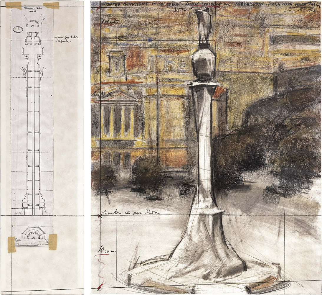Christo, Gabrovo 1935, Wrapped Monument to Cristobal Colon (Project for Barcelona), 1976, Tecnica mista su carta applicata su tavola, dittico, cm. 71,1x20 e cm. 71,1x55,6, Titolo, firma e data in alto, sull'elemento di destra: Wrapped Monument to Cristobal Colon (Project for Barcelona - Plaça Porta de la Pau) / Christo 1976. Al verso: cartiglio con dati dell'opera: indicazioni autografe di allestimento., Storia: Rosa Esman Gallery, New York; Collezione privata, Olanda; Collezione privata, L'opera sarà inclusa nel Christo Catalogue raisonné, a cura di Daniel Varenne, al n. 3232