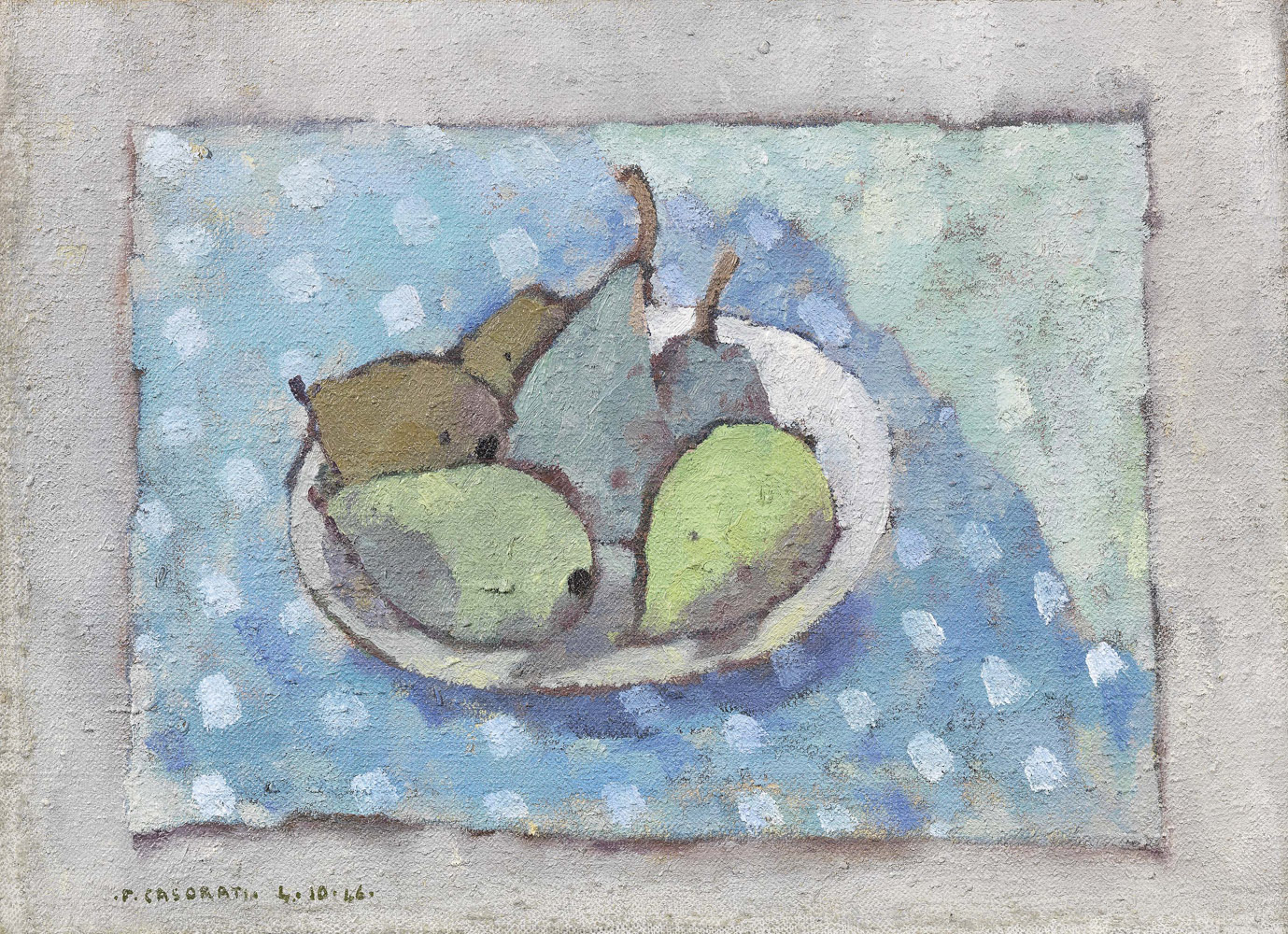 Felice Casorati, Novara 1883 - Torino 1963, Natura morta - Pere, 1946, Olio su tela, cm. 33,5x45,5, Firma e data in basso a sinistra: F. Casorati 4.10.46. Al verso sulla tela: etichetta Galleria Annunciata, Milano, con n. 3847; sul telaio: timbro Collezione Mazzotta, con n. 38: timbro Galleria del Milione, Milano, con n. 13021., Storia: Galleria del Milione, Milano; Collezione Mazzotta, Milano; Galleria Annunciata, Milano; Collezione privata, Certificato su foto Galleria Annunciata, Milano; certificato su foto Archivio Casorati, Torino 10/02/2011, con n. 1402., Esposizioni: 40 anni di mostre in due manifestazioni, seconda parte, Milano, Centro Annunciata, 14 novembre 1981 - 14 gennaio 1982, cat. n. 3;, E subito riprende il viaggio... Opere dalle collezioni del MA*GA dopo l'incendio, Monza, Villa Reale, 5 settembre 2013 - 6 gennaio 2014., Bibliografia: Pittori Italiani Contemporanei, Edizioni del Milione, Milano, 1951, n. 1059;, Giorgina Bertolino, Francesco Poli, Felice Casorati Catalogo Generale. I dipinti (1904-1963), 2 volumi, Umberto Allemandi e C., Torino, 1995, n. 756 (opera datata 1944)