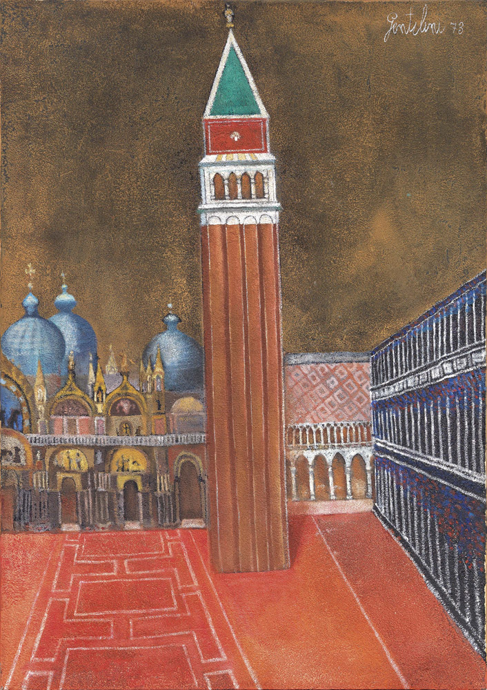Franco Gentilini, Faenza (Ra) 1909 - Roma 1981, Il campanile di San Marco, 1973, Olio su tela sabbiata, cm. 100x70, Firma e data in alto a destra: Gentilini 73. Sul telaio: etichetta Galleria d'Arte del Naviglio, Milano: timbro Naviglio, Venezia, con n. 121., Storia: Galleria del Naviglio, Milano; Collezione privata, Venezia; Galleria Marescalchi, Bologna; Collezione privata, Foto autenticate dall'artista, in data 1 marzo 1976 e 3 novembre 1978., Bibliografia: Luciana Gentilini, Giuseppe Appella, Gentilini. Catalogo generale dei dipinti 1923-1981, Edizioni De Luca, Roma, 2000, pp. 604, 605, n. 1358