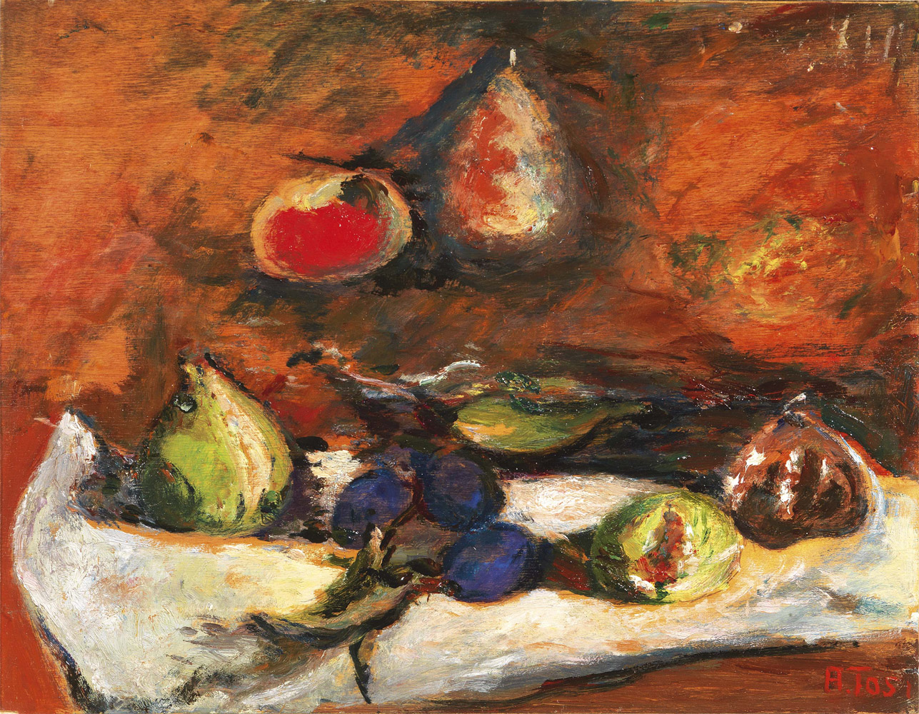 Arturo Tosi, Busto Arsizio (Va) 1871 - Milano 1956, Natura morta con prugne e fichi, 1945, Olio su tavola applicata, cm. 38,8x49,7, Firma in basso a destra: A. Tosi; firma al verso: A. Tosi: etichetta Galleria del Colleoni, Bergamo., Storia: Galleria del Colleoni, Bergamo; Collezione privata, Certificato su foto di Claudia Gian Ferrari, Milano, 19 dicembre 1998