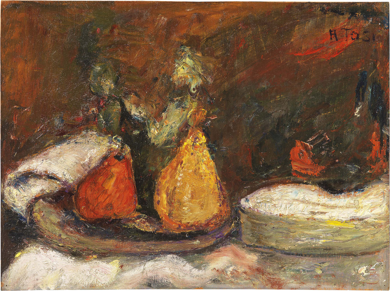 Arturo Tosi, Busto Arsizio (Va) 1871 - Milano 1956, Natura morta con pere, 1944, Olio su tavola, cm. 38x49,8, Firma in alto a destra: A. Tosi (apposta successivamente); firma, luogo e data al verso: A. Tosi / Rovetta / 1944., Storia: Galleria del Colleoni, Bergamo; Collezione privata, Certificato su foto di Claudia Gian Ferrari, Milano, 19 dicembre 1998