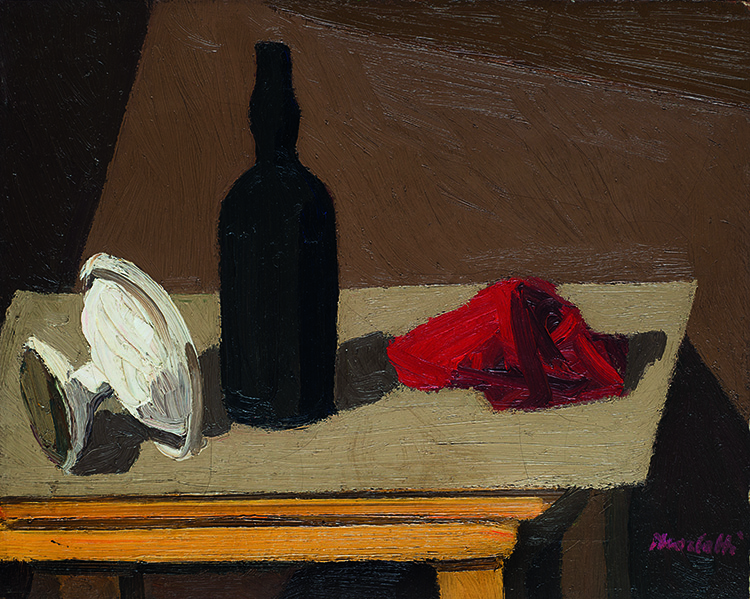 Natura morta [sul tavolo con fruttiera bianca bottiglia nera e