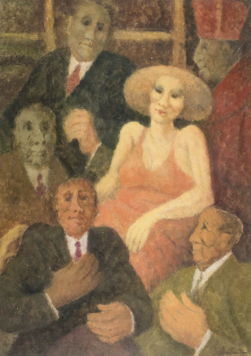 Remo Squillantini ( Stia 1920 1996 ) Donna con cardinale anni '80 Olio su tela, cm. 70x50 Firmato in basso a destra. Sul verso: firma. Autentica di Paola e Riccardo Squillantini su foto, con timbro a secco e Archivio n° 127/16.