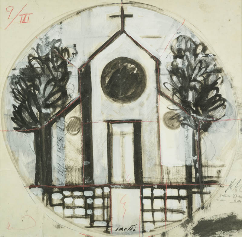 Bruno Saetti ( Bologna 1902 1984 ) Chiesetta accogliente Tecnica mista su carta intelata, cm. 72x75 Firmata in basso al centro L'opera fa' parte del bozzetto dei tondi per le vetrate di San Giovanni Bosco a Roma Pubblicato sul Catalogo Generale delle Opere di Bruno Saetti, III Vol. pag. 428 tav. 55.