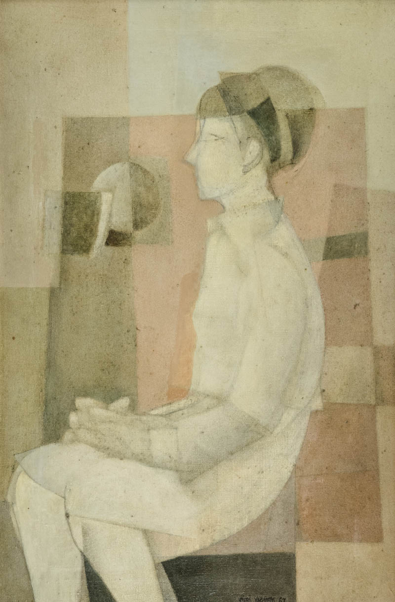 Vieri Vagnetti ( 1936 1994 ) Figura seduta - Giulia 1965-67 Olio su tela, cm. 90x60 Firma e data in basso a destra. Sul verso: firma, data e titolo e scritto di Autenticità dell'Artista. Etichetta: "Galleria Michaud", Firenze. Etichetta usurata "Galleria Levi", Milano, con descrizione. Etichetta Usurata: "Concorso Internazionale 1968 , La donna d'oggi nella pittura", Milano con descrizione. Autentica dell'Artista su foto.