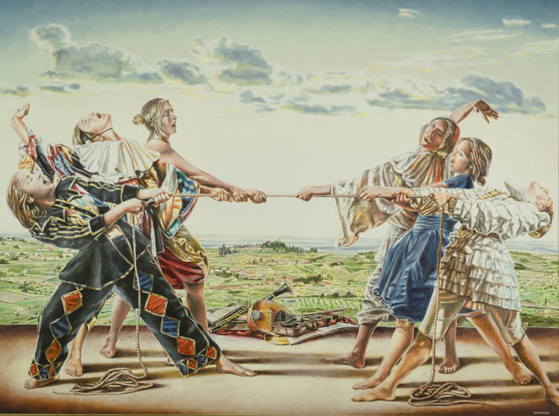 Sergio Nardoni ( Firenze 1947 ) Antagoniste Olio su tela, cm. 60x80. Firmato in baso a destra; Sul verso: firma e titolo e timbro "Archivio fotografico Nardoni", con n° 801. Autentica dell'Artista su foto con timbro "Archivio Fotografico Nardoni" e Archivio n° 801. Certificato dell'Archivio Fotografico Nardoni.