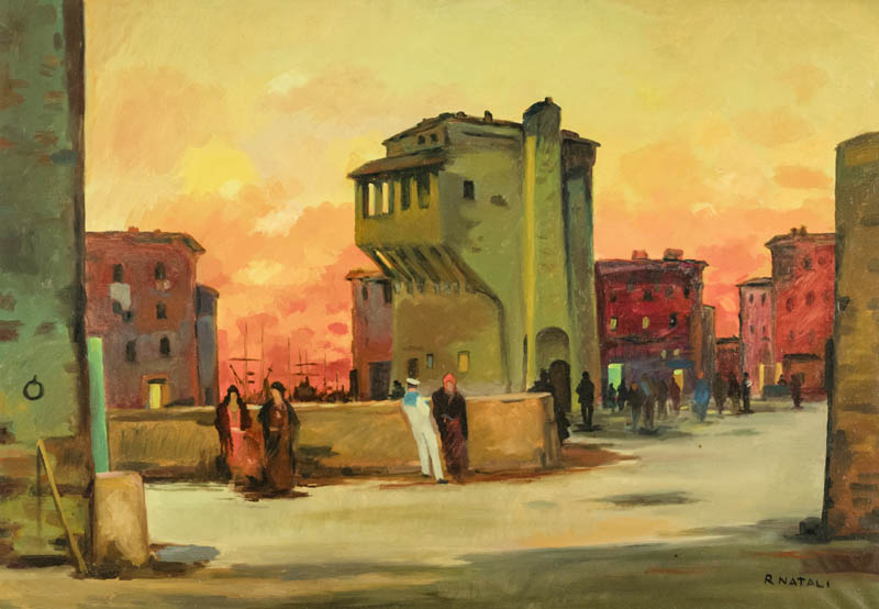 Renato Natali ( Livorno 1883 1979 ) Vecchia Livorno 1959 c.a. Olio su tela, cm. 70x100 Firmato in basso a destra. Sul verso: firma e data. Autentica di Elio Tomei su foto.