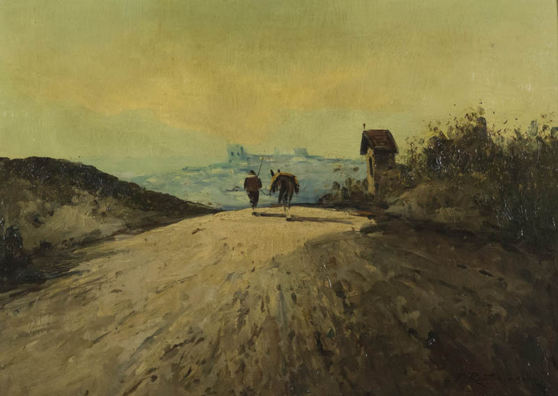 Ferruccio Rontini ( Firenze 1893 Livorno 1964 ) Ritorno dal lavoro Olio su tavola, cm. 50x70 Firmato in basso a destra.