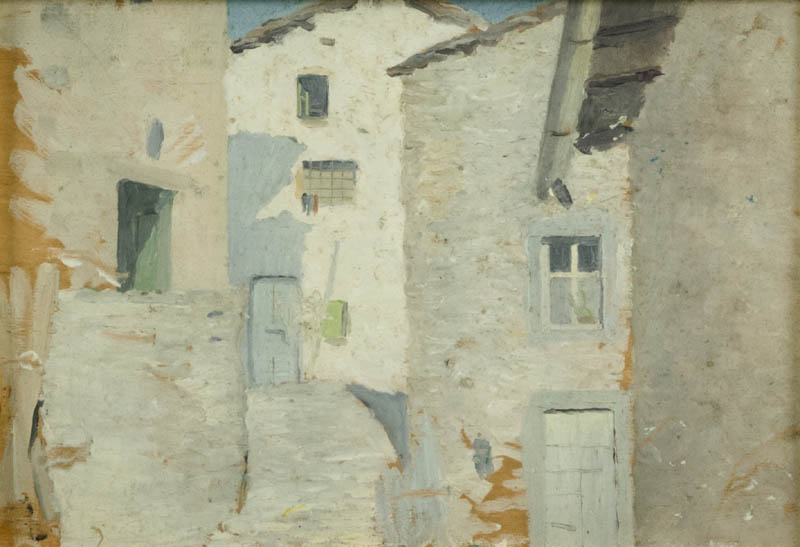 Vittorio Matteo Corcos ( Livorno 1859 Firenze 1933 ) Strada di paese Olio su tavola, cm. 18x26 Sul verso: Etichetta Galleria d'Arte Moderna Palazzo Pitti, Museo Civico Giovanni Fatttori". Etichetta:con titolo, provenienza e descrizione.