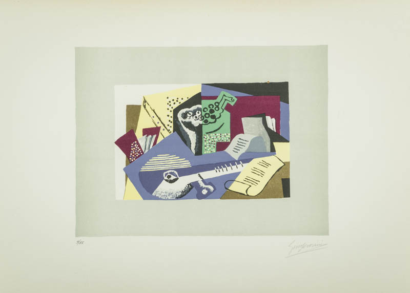 Gino Severini ( Cortona (Ar) 1883 Parigi 1966 ) Natura morta con strumenti musicali Litografia su carta, cm. 37x50, es. 9/85 Firma in basso a destra, tiratura in basso a sinistra.