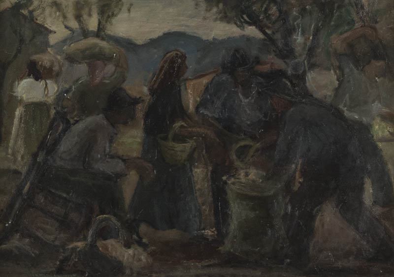 Guido Ferroni ( Siena 1888 Firenze 1979 ) Contadini Olio su cartone, cm. 50x70 Firmato in basso a sinistra. Sul verso: cenni di provenienza.