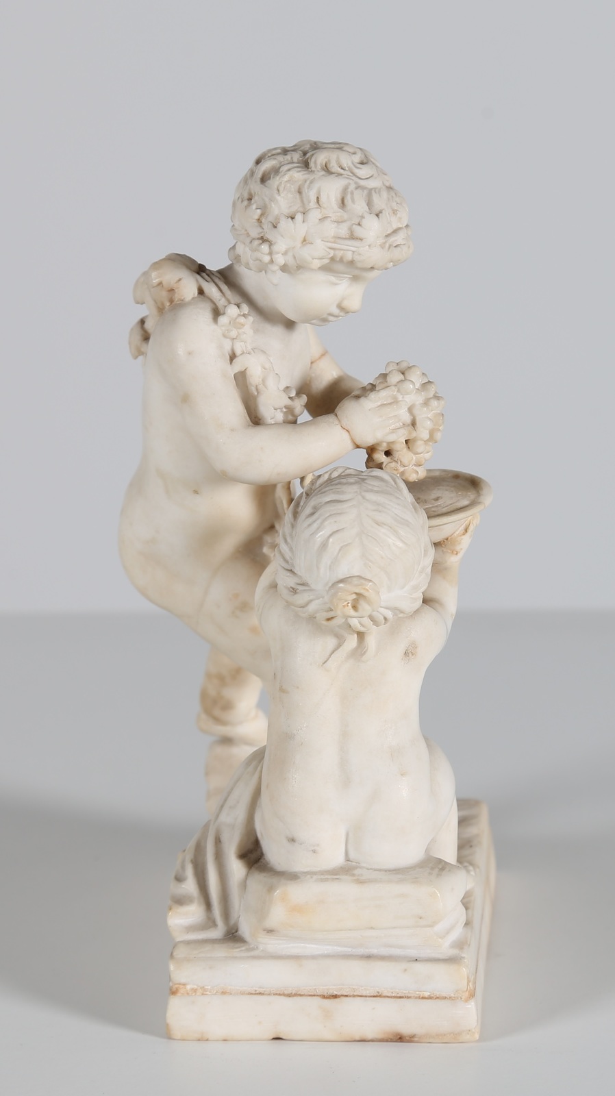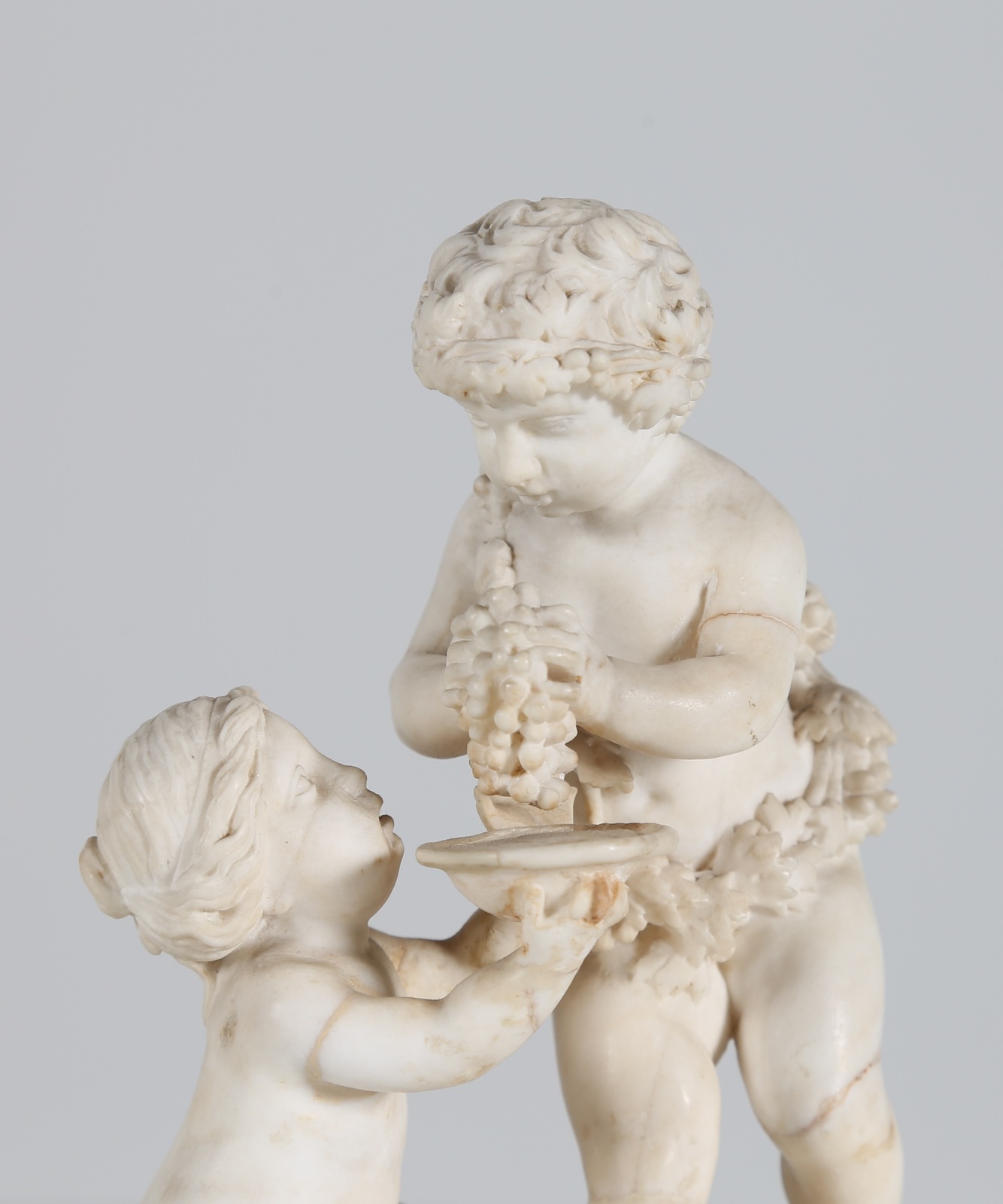 MANIFATTURA ITALIANA DEL XIX SECOLO Coppia di puttini in marmo. . Cm 9,50 x 16,00 x 7,50. Presenti rotture.