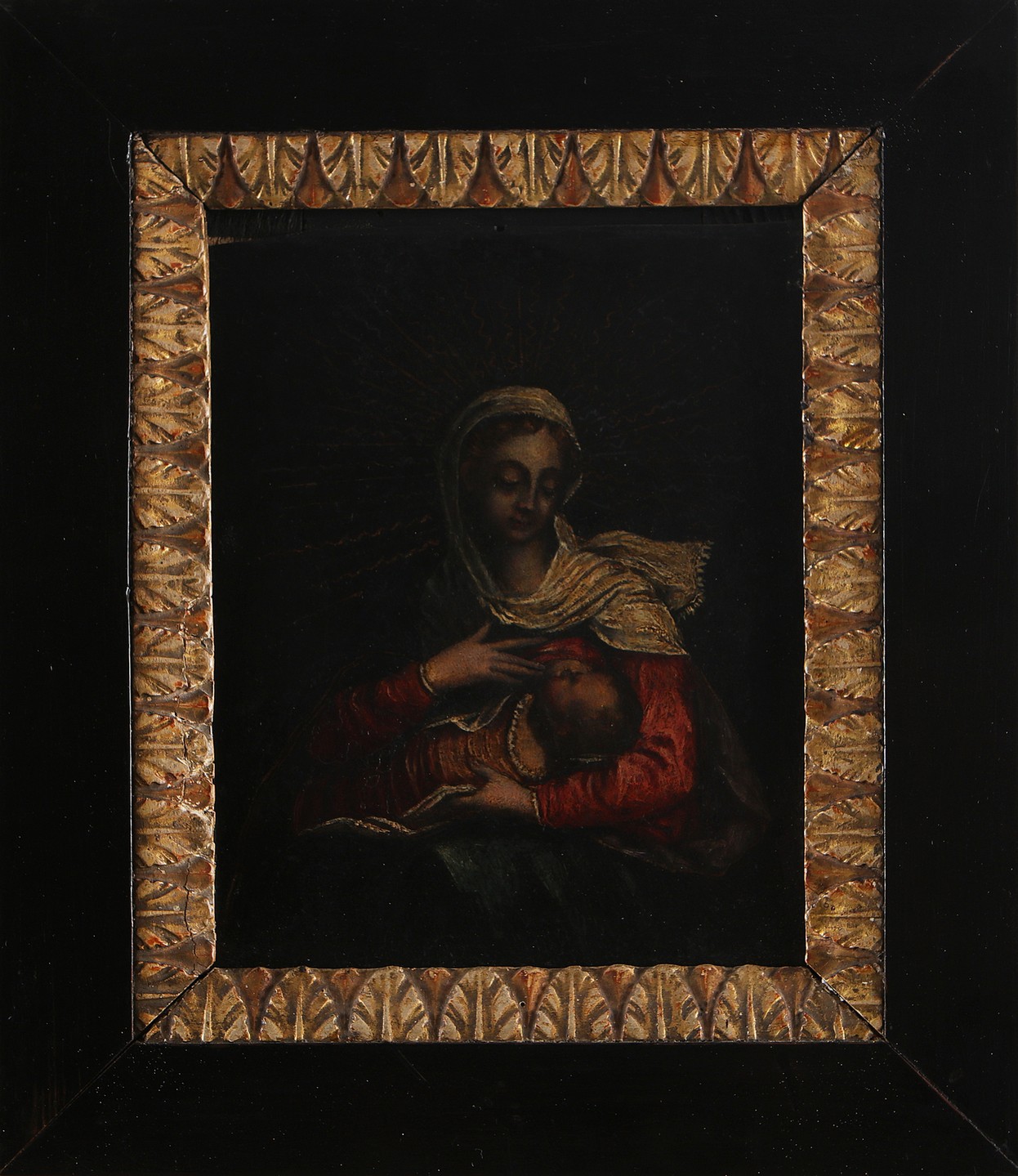 ARTISTA DEL XVII SECOLO. Madonna con bambino. . Olio su rame. Cm 8,00 x 14,00. . Cornice presente
