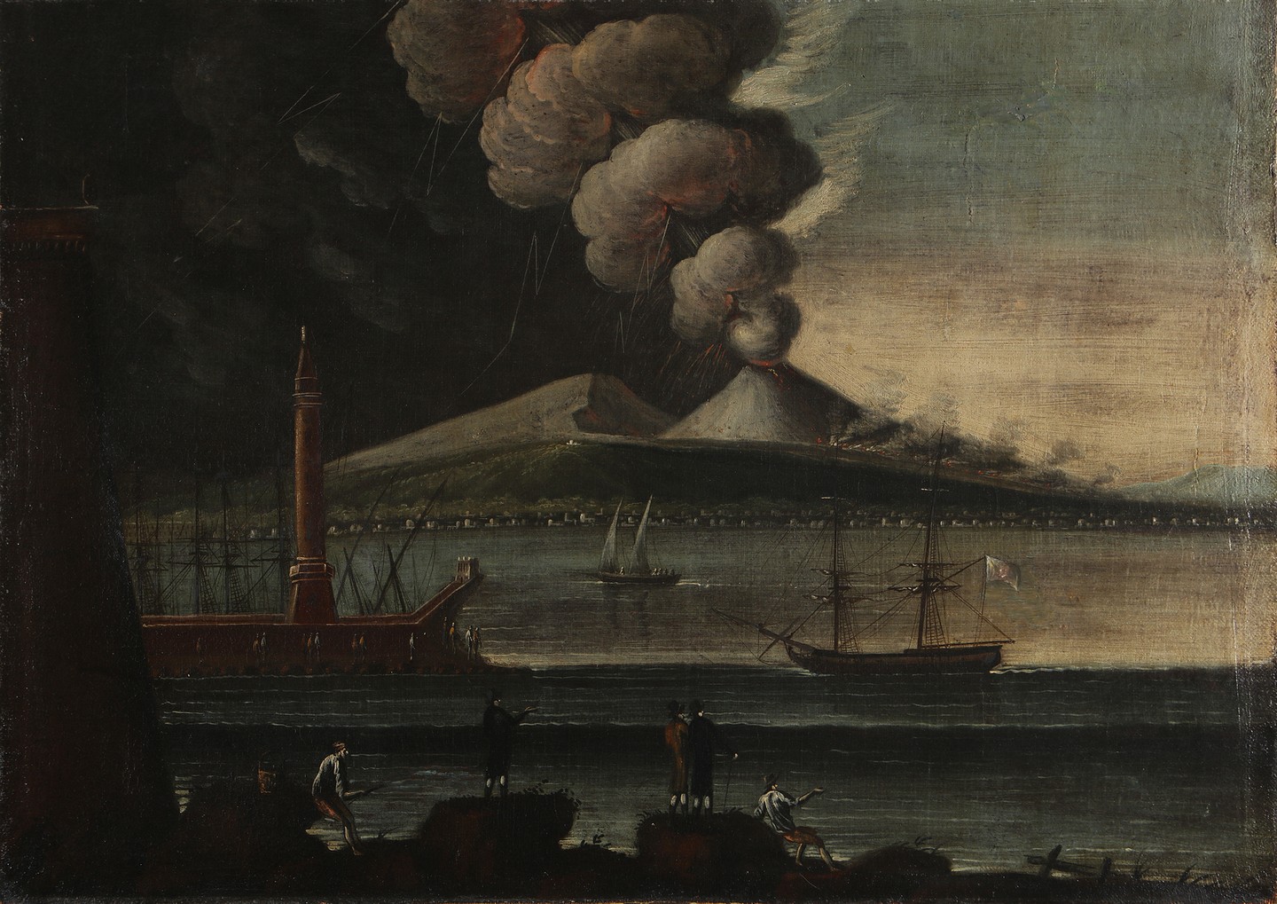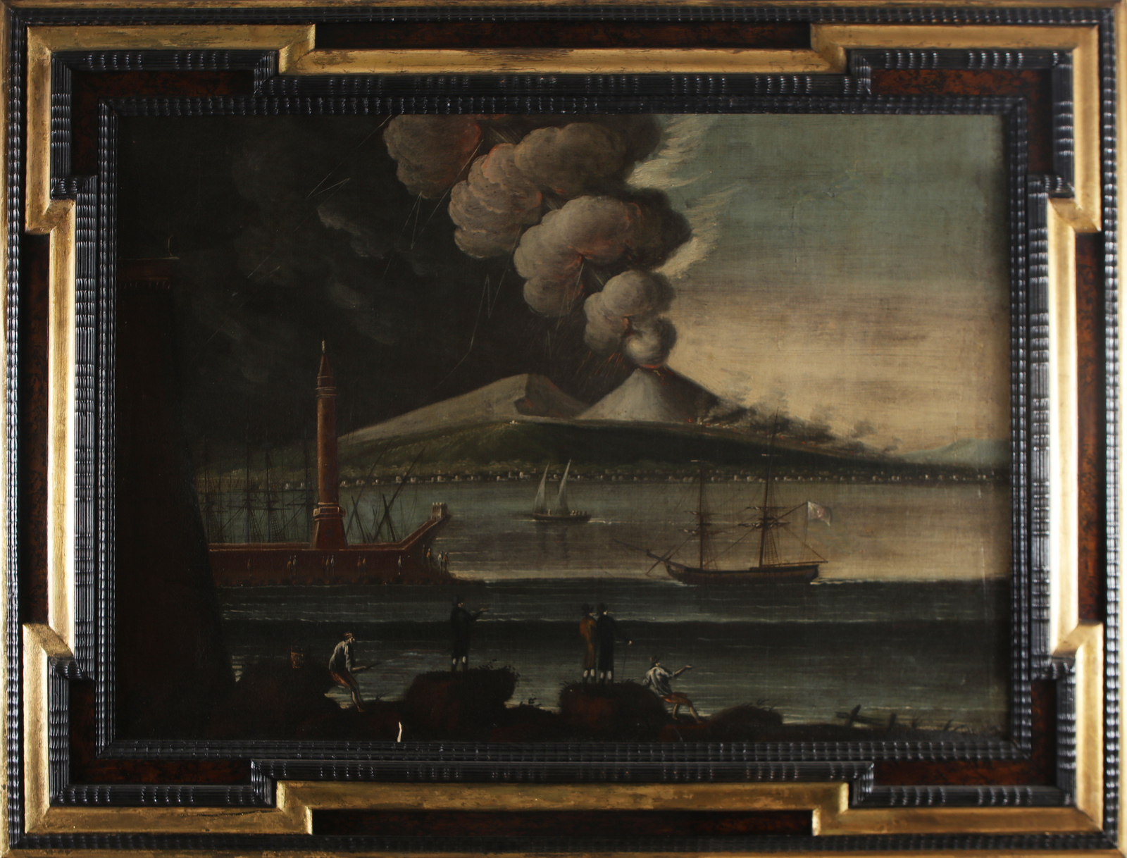 ARTISTA NAPOLETANO DEL XVIII SECOLO Eruzione del Vesuvio. Olio su tela . Cm 100,00 x 70,00. Rintelo moderno. Cornice presente