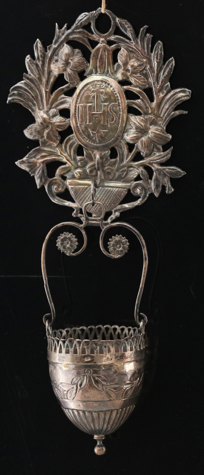 MANIFATTURA ITALIANA DEL XVIII SECOLO Acquasantiera con le iniziali IHS al centro circondate da quattro fiori e contenitore removibile. . Cm 25,00. Punzone p40a.