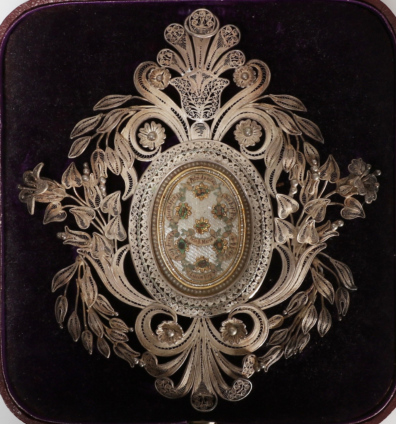 MANIFATTURA ITALIANA DEL XVIII SECOLO Pendente reliquario in argento sbalzato...