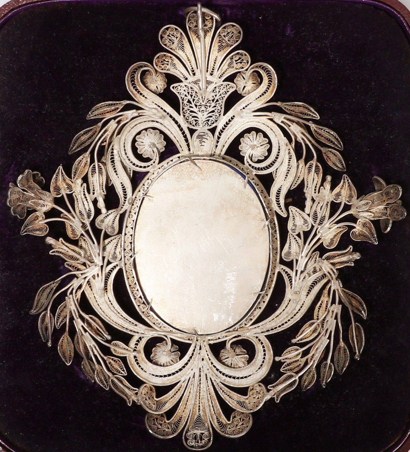 MANIFATTURA ITALIANA DEL XVIII SECOLO Pendente reliquario in argento sbalzato con motivi fogliacei e vegetali. . Cm 14,00 x 16,00. Peso lordo gr 118. Presente cofanetto originale.