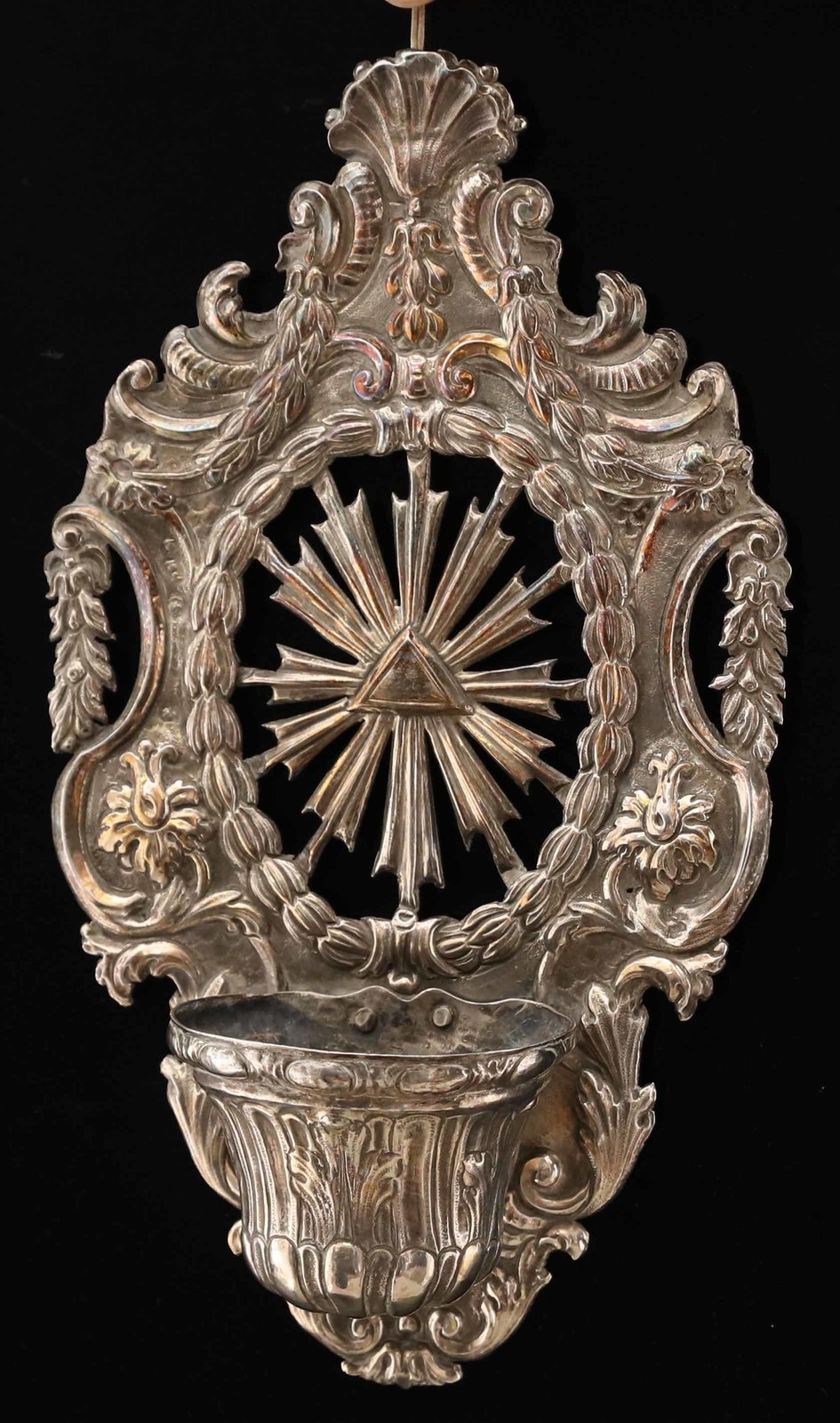 MALCONTENTI DIONIGIO LODOVICO (1732 - 1781) Acquasantiera in argento sagomato e sbalzato con triangolo che rappresenta la Trinità al centro. . . Cm 14,00 x 22,00. Punzone dell'argentiere all'insegna del cuore trafitto sormontato da corona, punzone all'insegna del calice, altro punzone non identificato. Bibliografia V. Donaver - R. Dabbene, Argenti italiani del settecento, n 2082, p. 250.