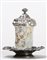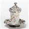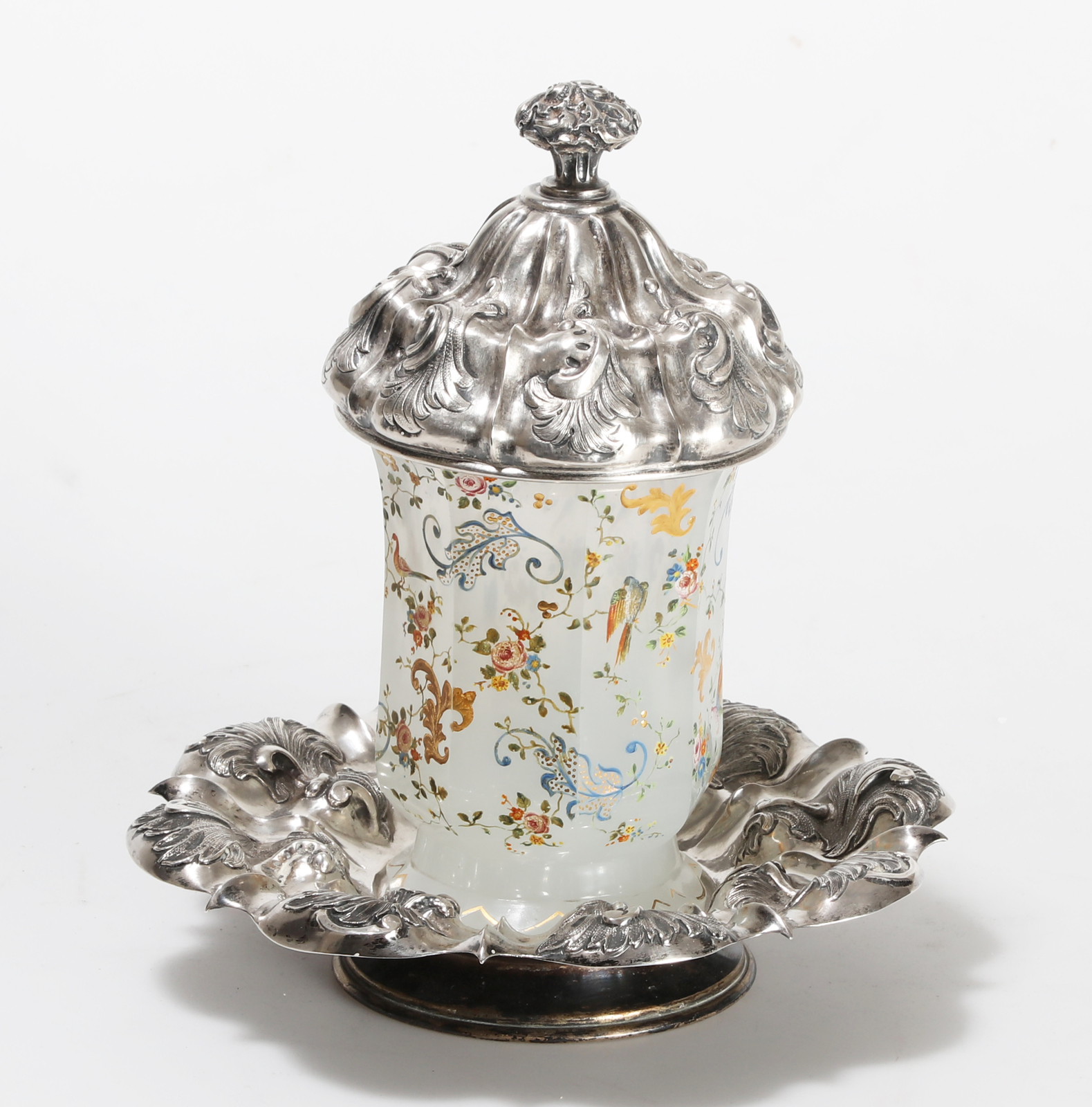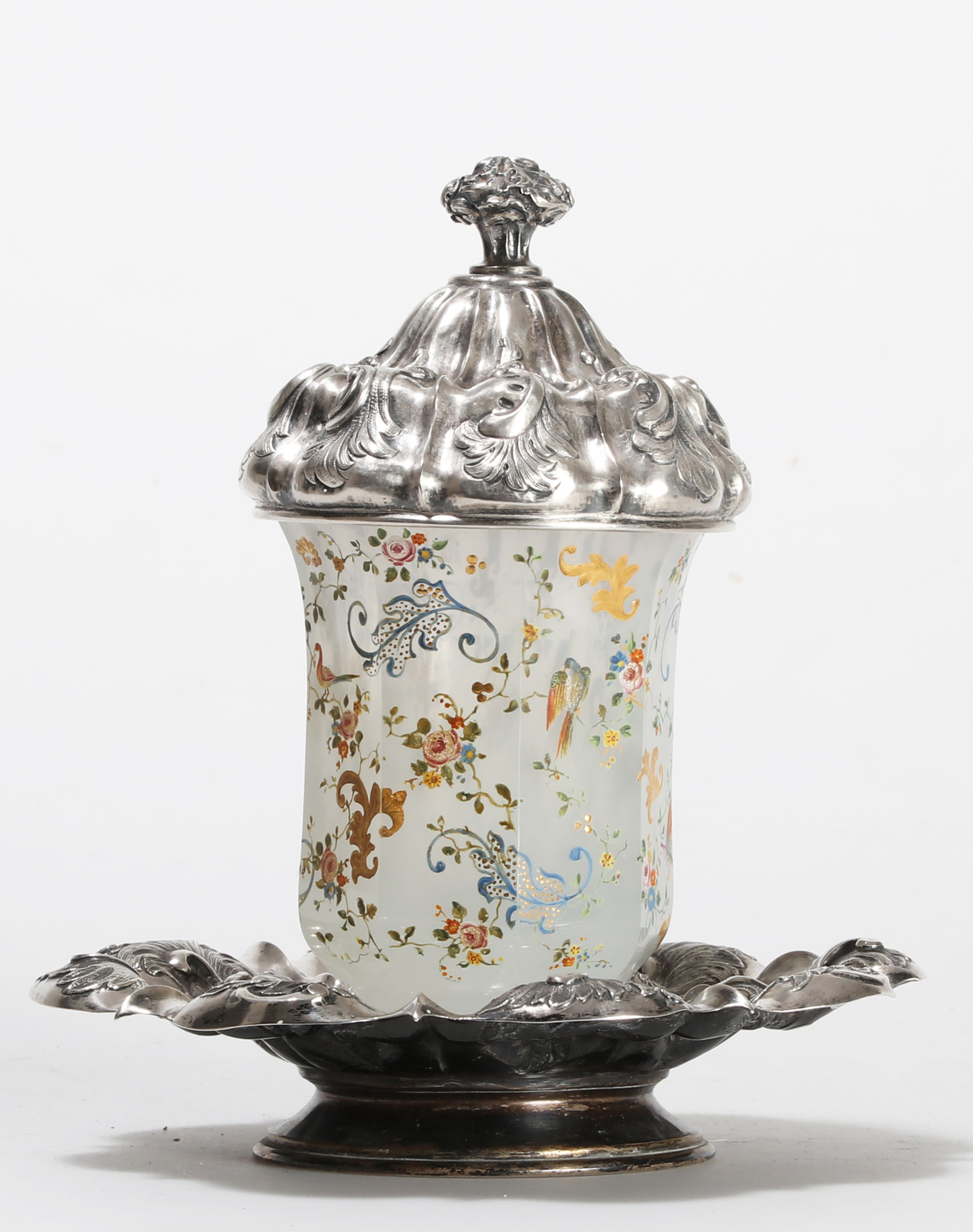 MANIFATTURA ITALIANA DEL XIX SECOLO Bicchiere in cristallo decorato a motivi vegetalii con vassoio e coperchio in argento. . Cm 19,00 x 21,00. Punzoni alla base del vassoio.Peso dell'argento gr 242.