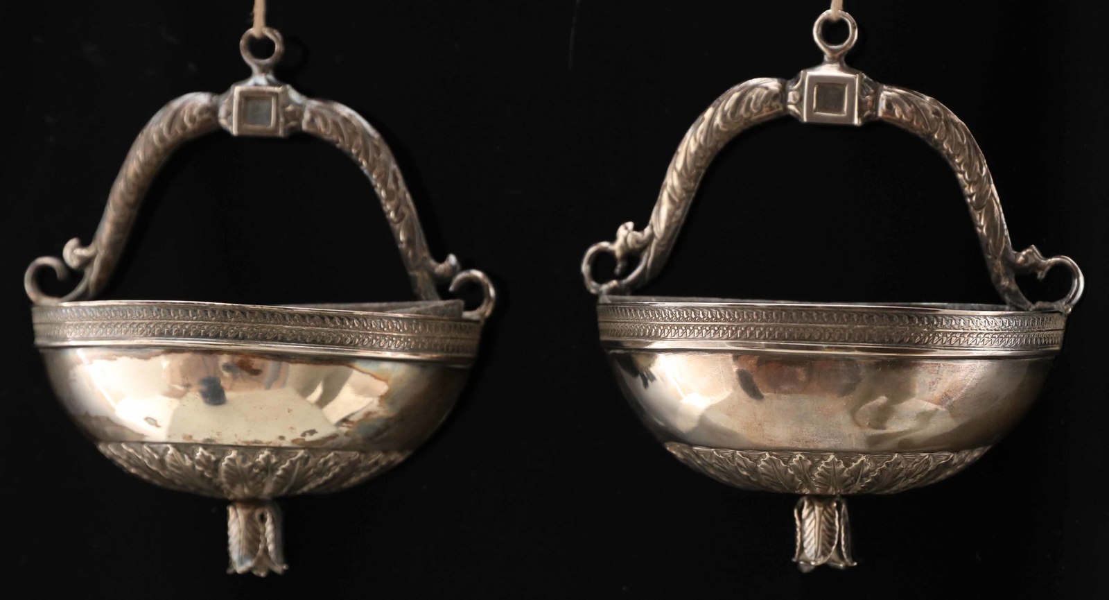 MANIFATTURA LOMBARDA DEL XIX SECOLO Coppia di acquasantiere in argento sbalzato e cesellato. . Cm 11,00 x 11,00.