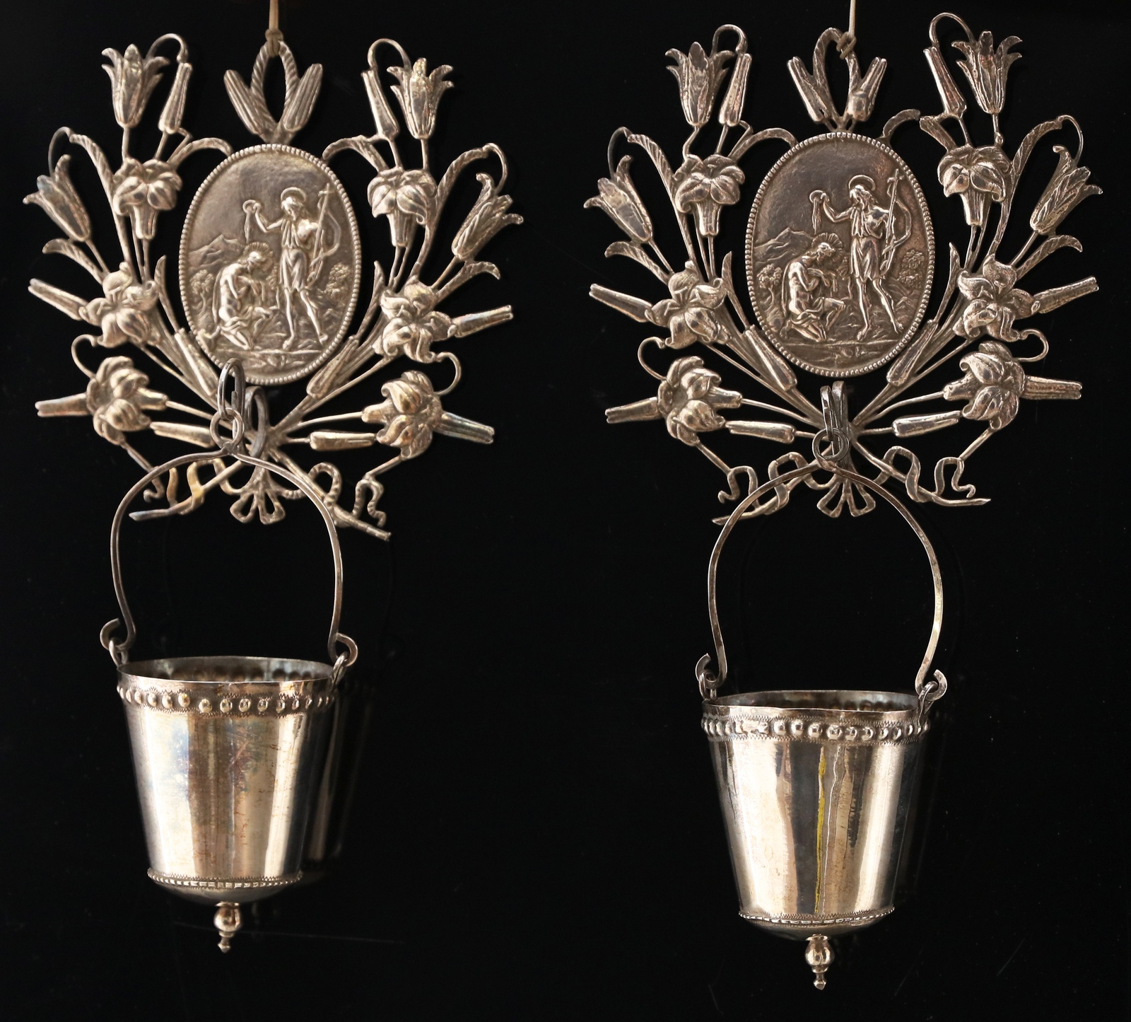 MANIFATTURA ITALIANA DEL XIX SECOLO Coppia di acquasantiere in argento con al centro il battesimo di Cristo, vaschette removibili. . Cm 22,50.