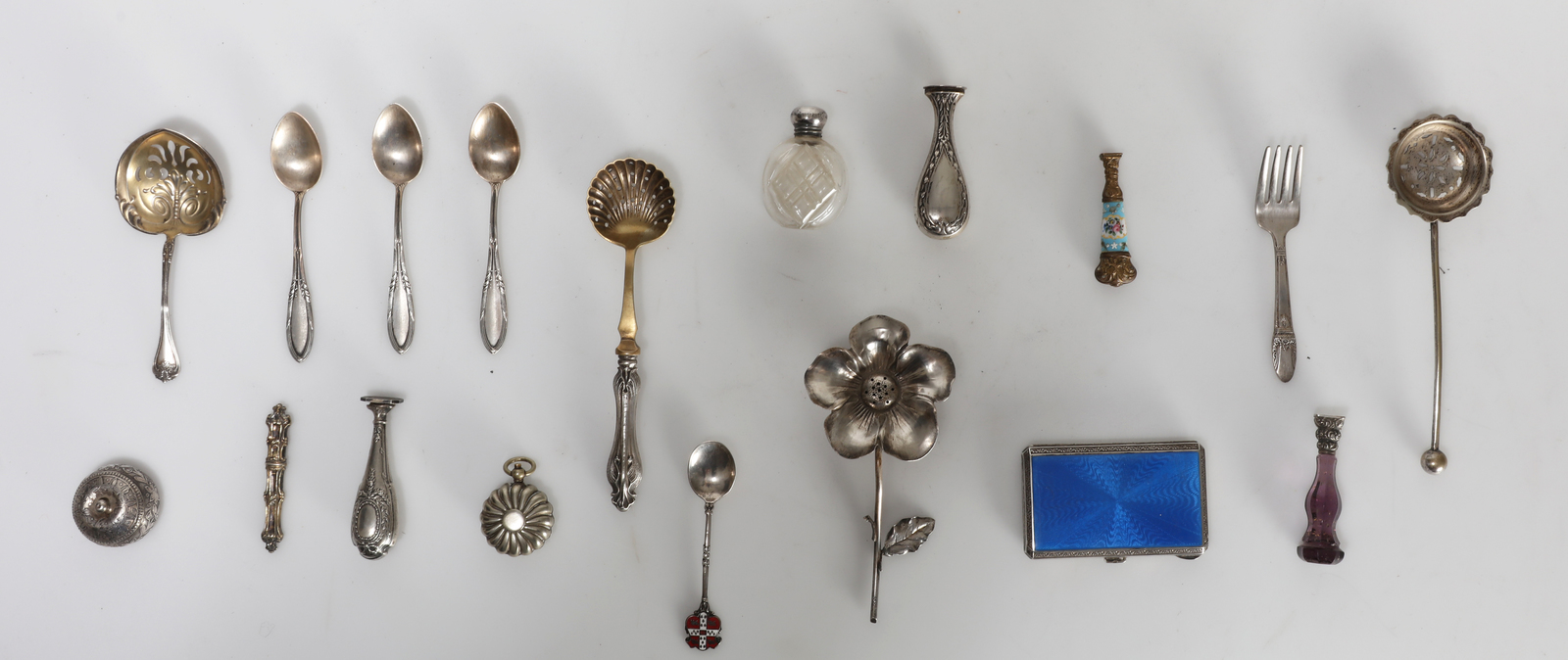 MANIFATTURA ITALIANA DEGLI INIZI DEL XX SECOLO Lotto composto da: 3 cucchiaini, 1 cucchiaino con stemma, 1 piccolo contenitore, 1 portasigarette, 3 cucchiaio forato, 1 fiore, 1 porta messaggi, 1 forchetta, 4 timbri per la ceralacca, 1 snufbottle, 1 orologio da tasca. . . Peso lordo gr. 398.