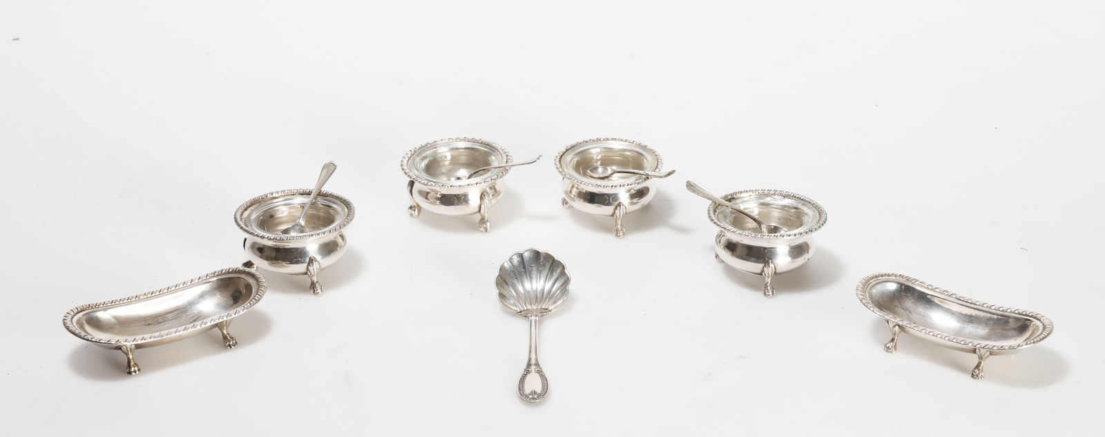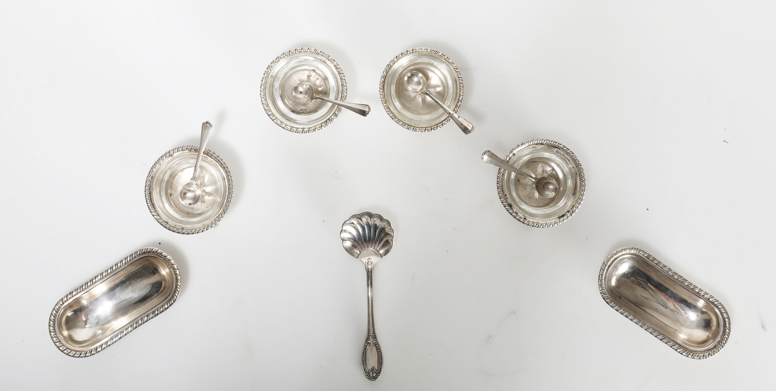 MANIFATTURA ITALIANA DEL XX SECOLO Lotto in argento composto da: 4 saliere con vetro e rispettivi cucchiaini, 2 porta stuzzicadenti, 1 cucchiaio. . . Punzone 800. Peso gr 426. Dimensioni saliere: 3x6x6 cm. Dimensioni porta stuzzicadenti: 2x10x5 cm.
