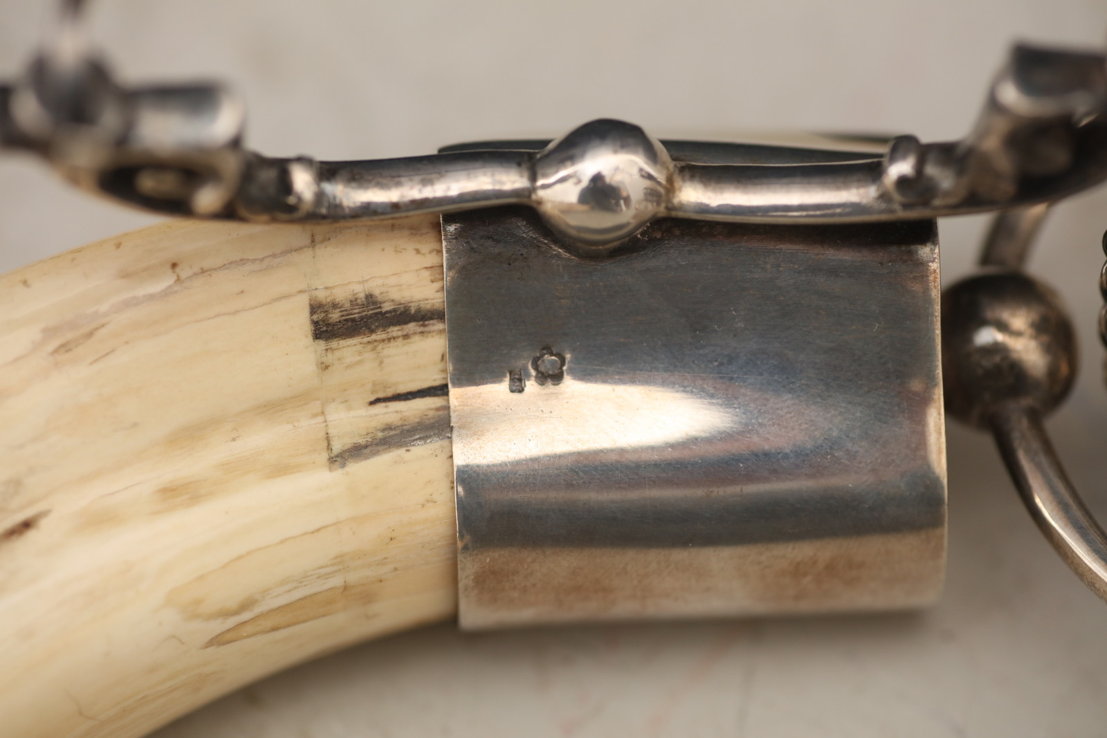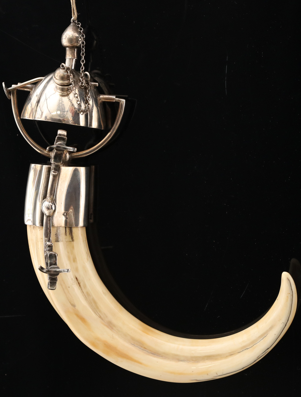 ARGENTIERE DEL XX SECOLO Fiaschetta in argento montata su zanna di cinghiale. . Cm 11,00 x 20,00. Punzoni M e N8 con insegna non identificata.