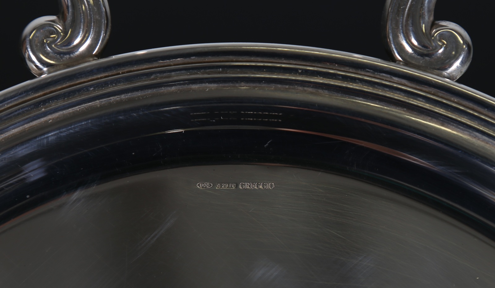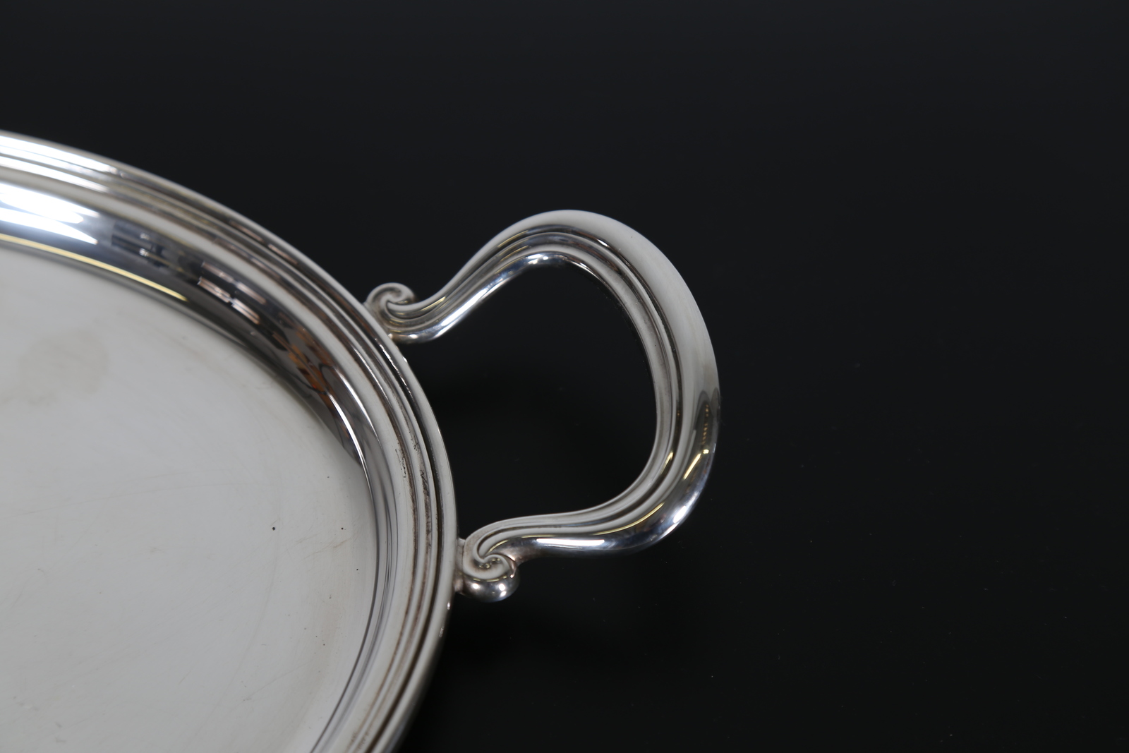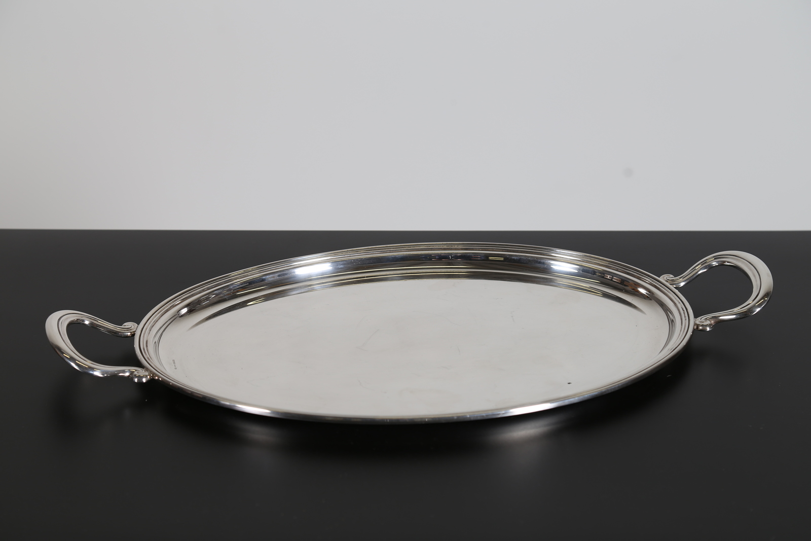ARGENTIERE DEL XX SECOLO Vassoio ovale in argento con manici. . Cm 48,50 x 1,00 x 28,50. Punzone 800 e Greggio. Peso gr 872.