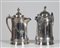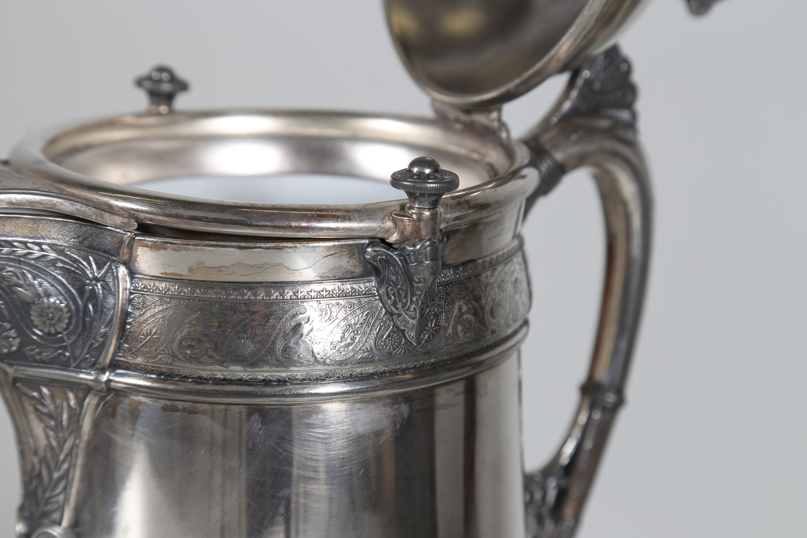MANIFATTURA INGLESE DEL XIX SECOLO Coppia di tankard in sheffield cesellato con interno in ceramica. . Cm 26,00 x 33,50 x 14,00. Expertise a cura di La Soffitta Martini, Cernobbio. Punzoni alla base. Peso loro kg 7 circa.