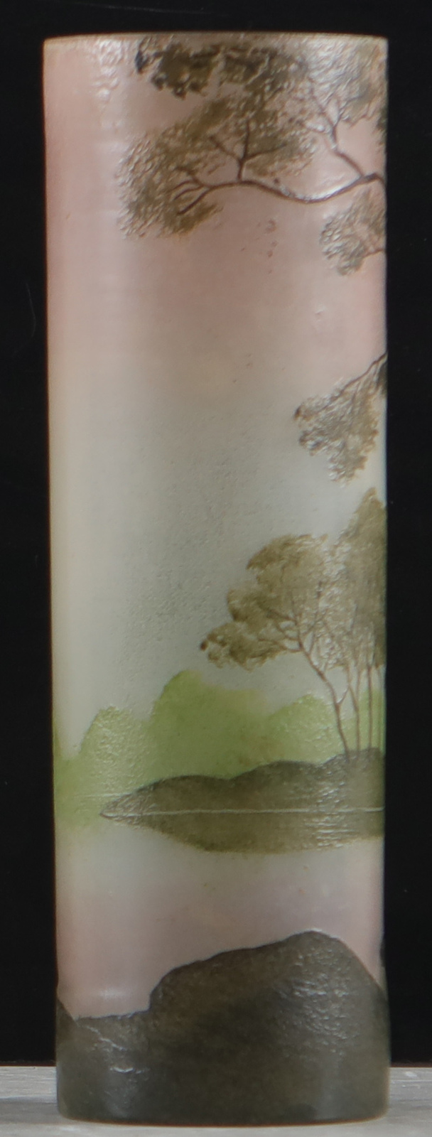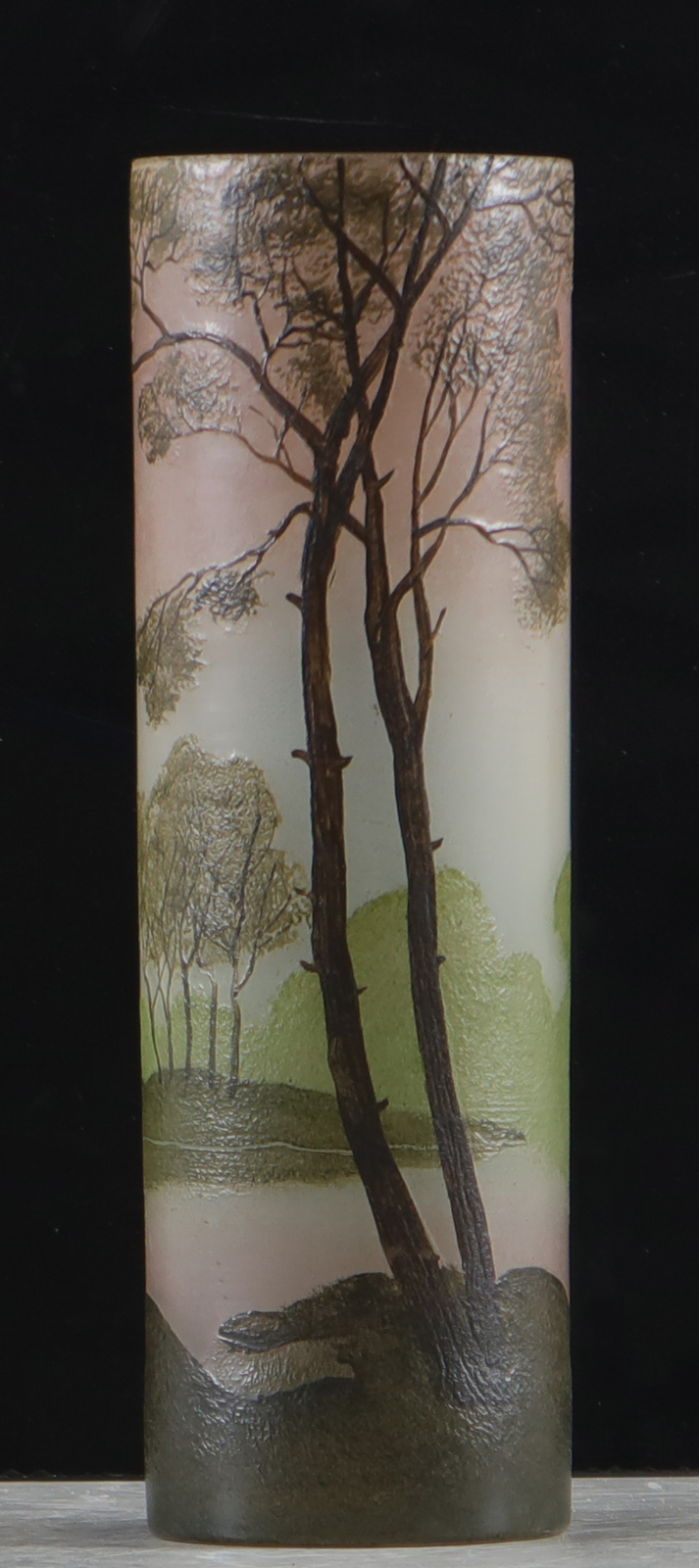 MANIFATTURA LEGRAS Vaso in vetro lavorato all'acido a cammeo con decoro di paesaggio fluviale. . Cm 8,00 x 25,00. firmato Legras.