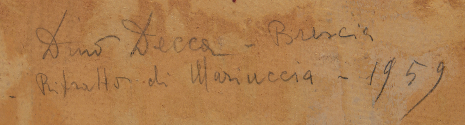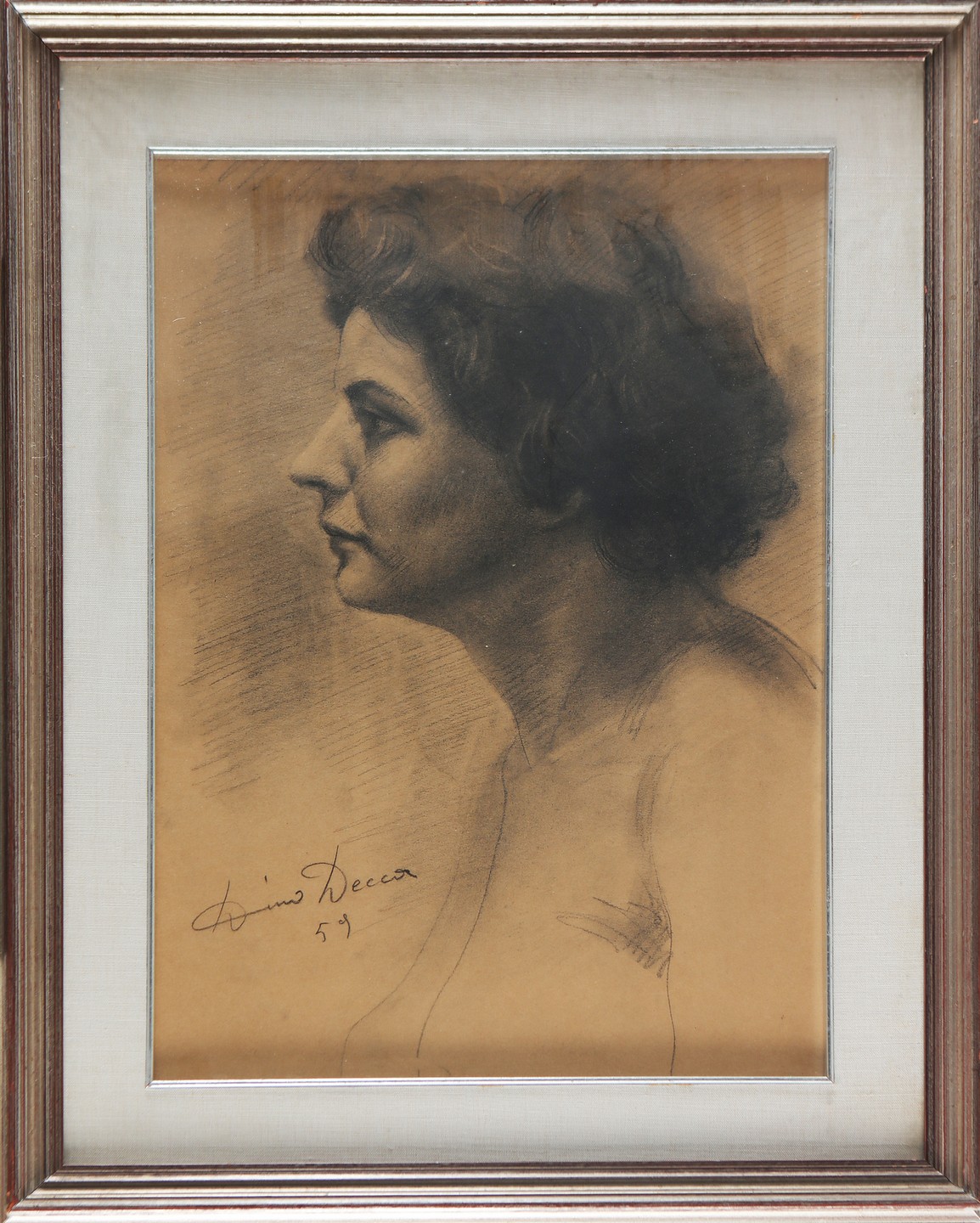 DECCA DINO (1935 - 2005) Ritratto di Mariuccia. 1959. Disegno a matita su cartone.. Cm 40,00 x 60,00. Firtma e anno in basso a sinistra. Al retro titolo firma e anno. Cornice presente