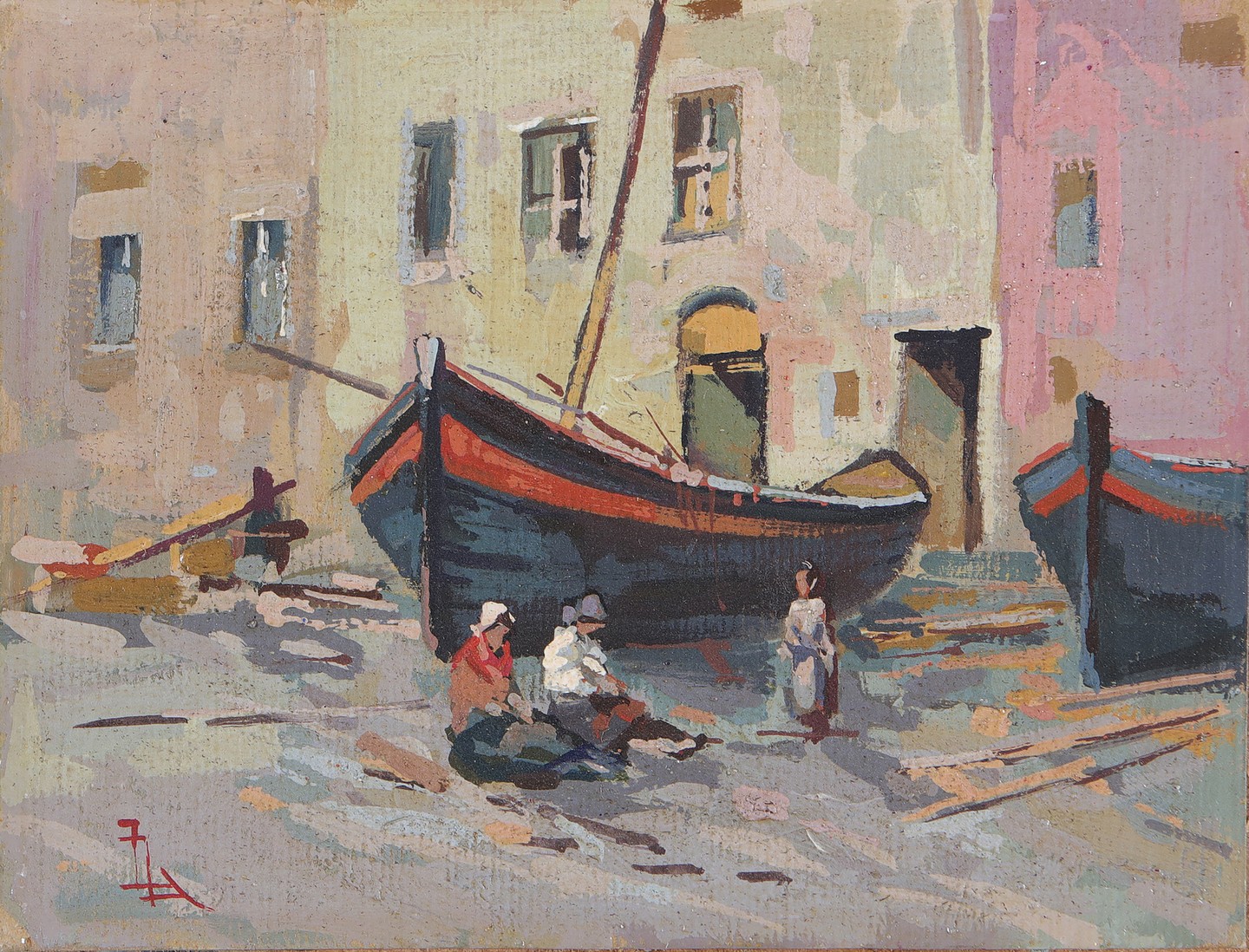 LOMBARDI LUIGI (1853 - 1940) Barche con figure. Olio su carta incollato su faesite. Cm 23,00 x 17,00. Firma in basso a sinistra. Cornice presente