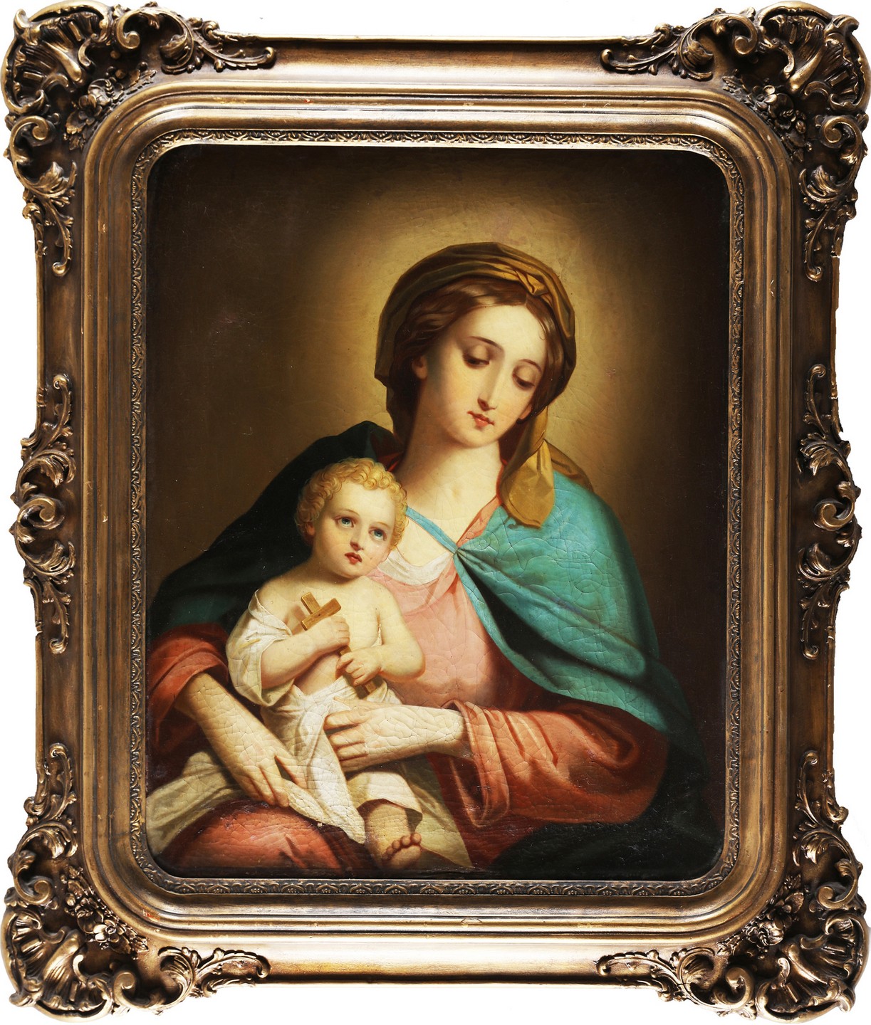 ARTISTA DEL XIX SECOLO Madonna con bambino. . Olio su tela . Cm 61,00 x 77,00. . Cornice presente