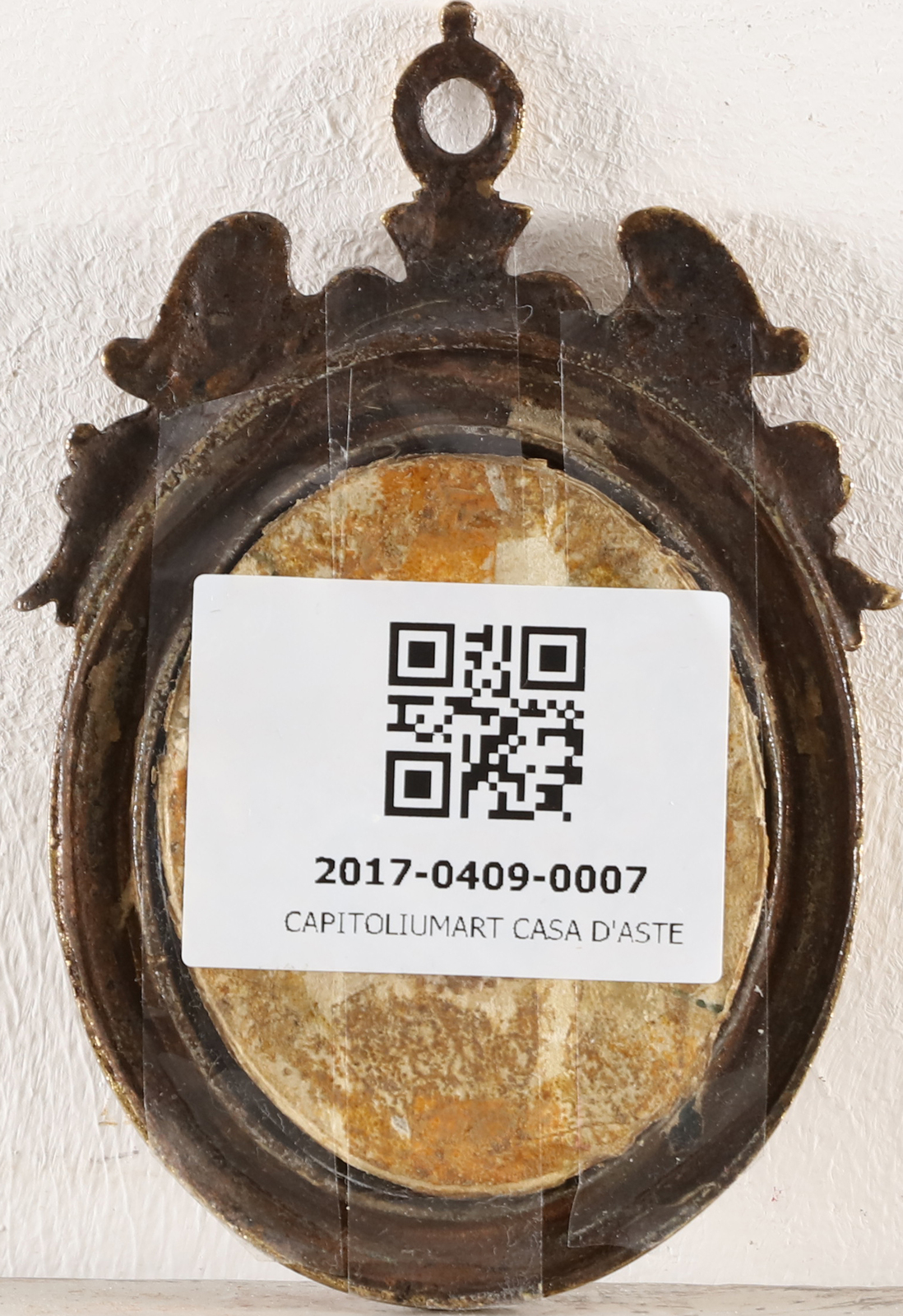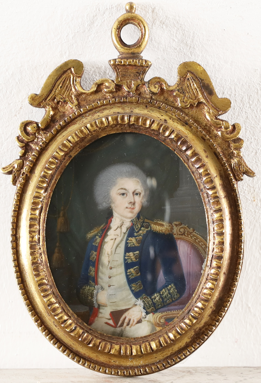 MINIATURISTA DEL XVIII SECOLO Ufficiale con libro. Olio su avorio. Cm 5,50 x 7,00. Cornice in metallo traforato.