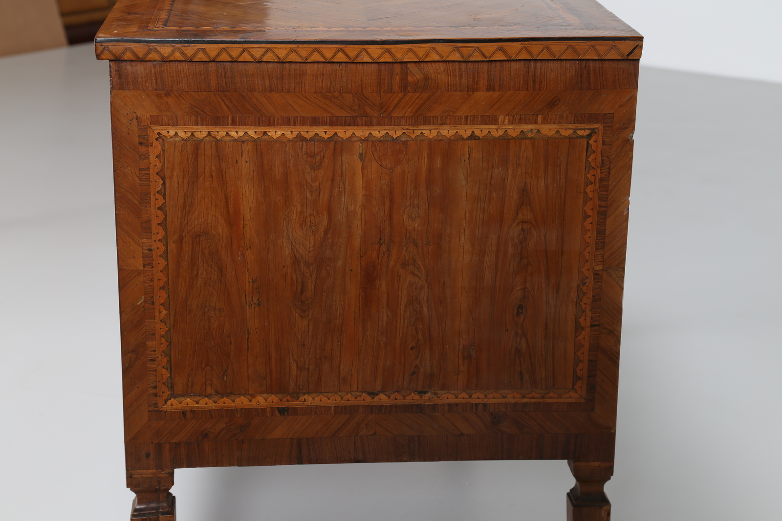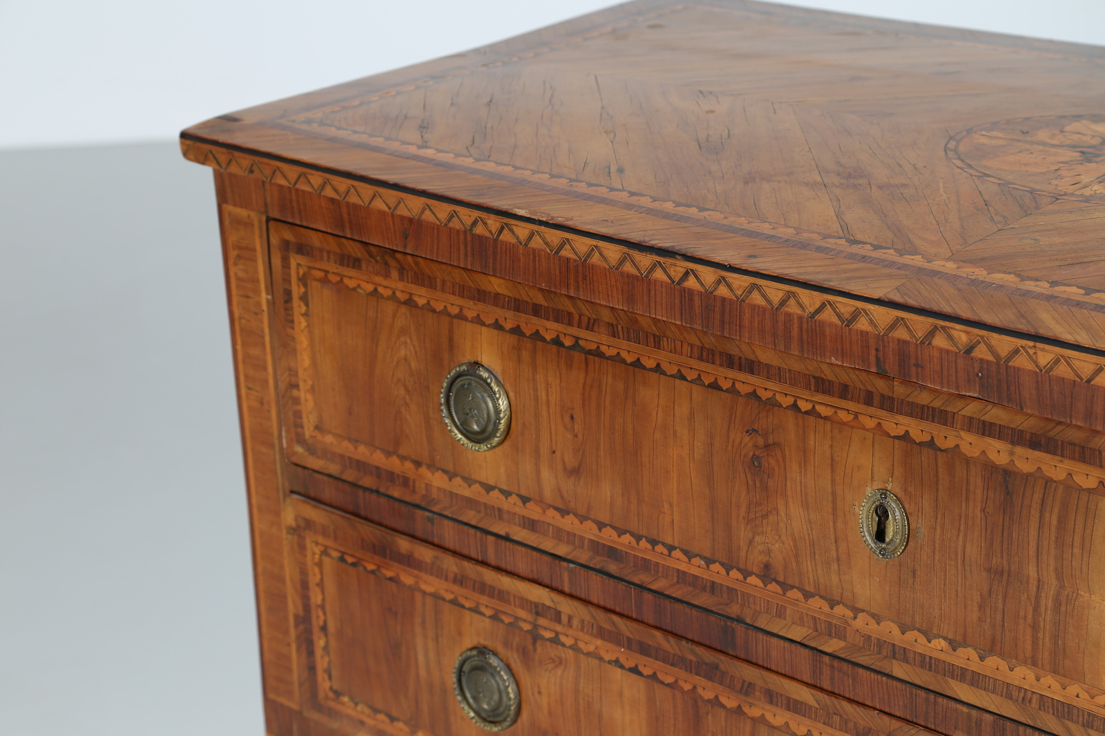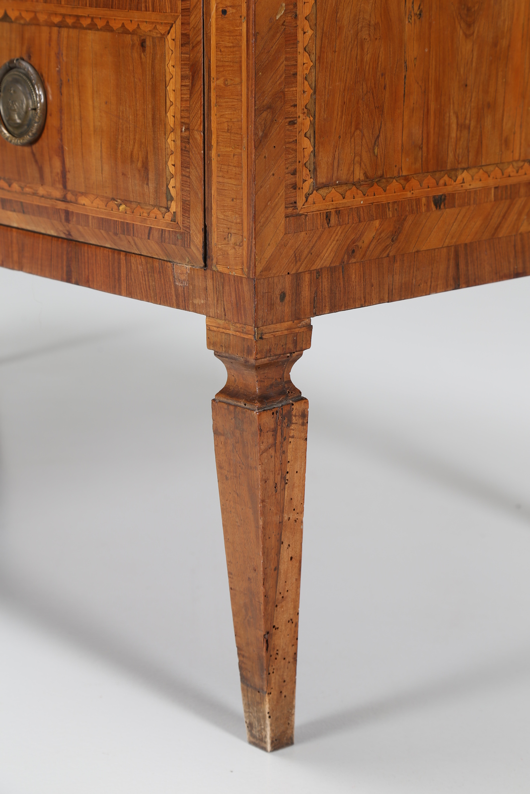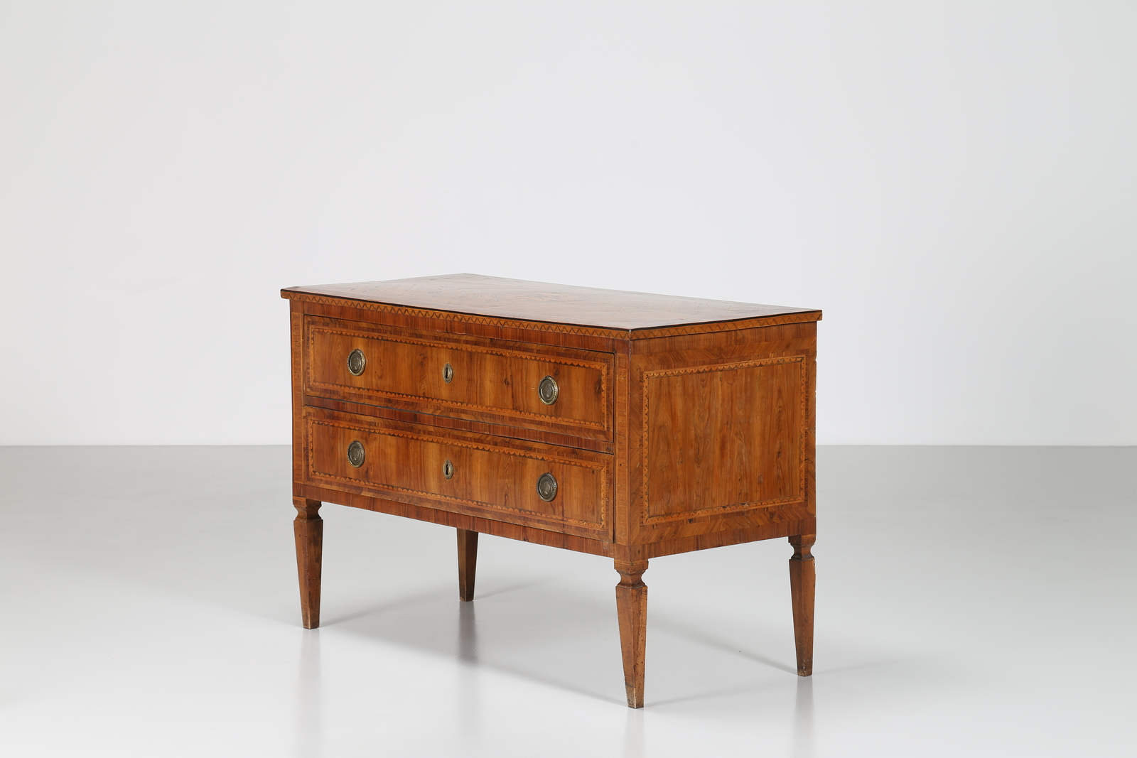 MANIFATTURA LOMBARDA DEL XVIII SECOLO Cassettone a due cassetti lastronato e intarsiato a motivi geometrici e vegetali, gambe a piramide rovesciata. . Cm 121,00 x 81,00 x 57,00. Difetti.
