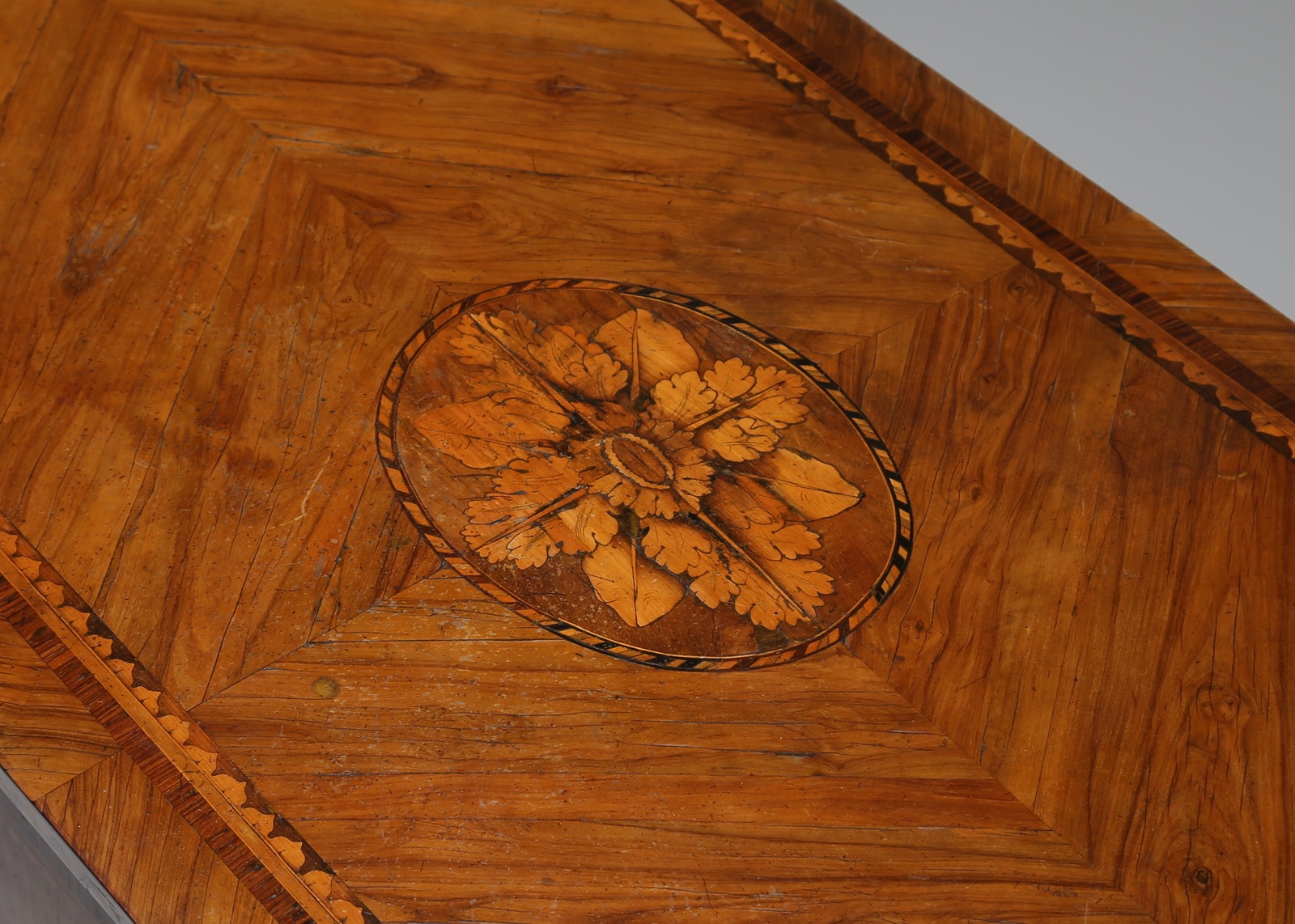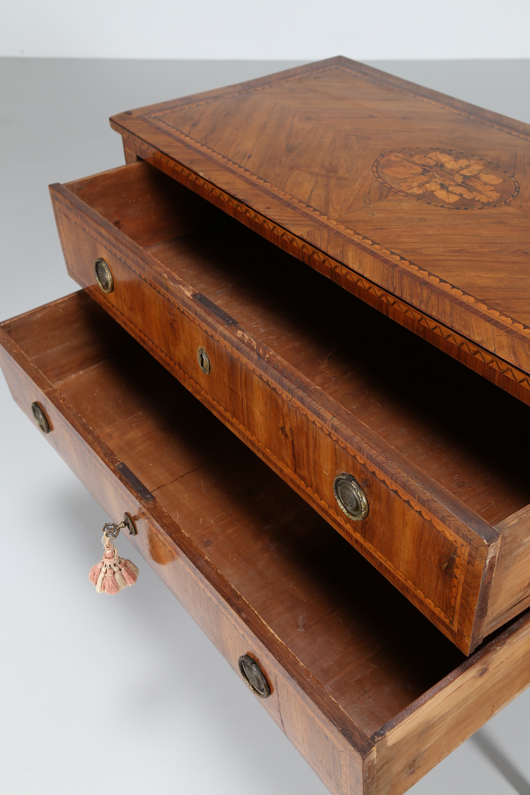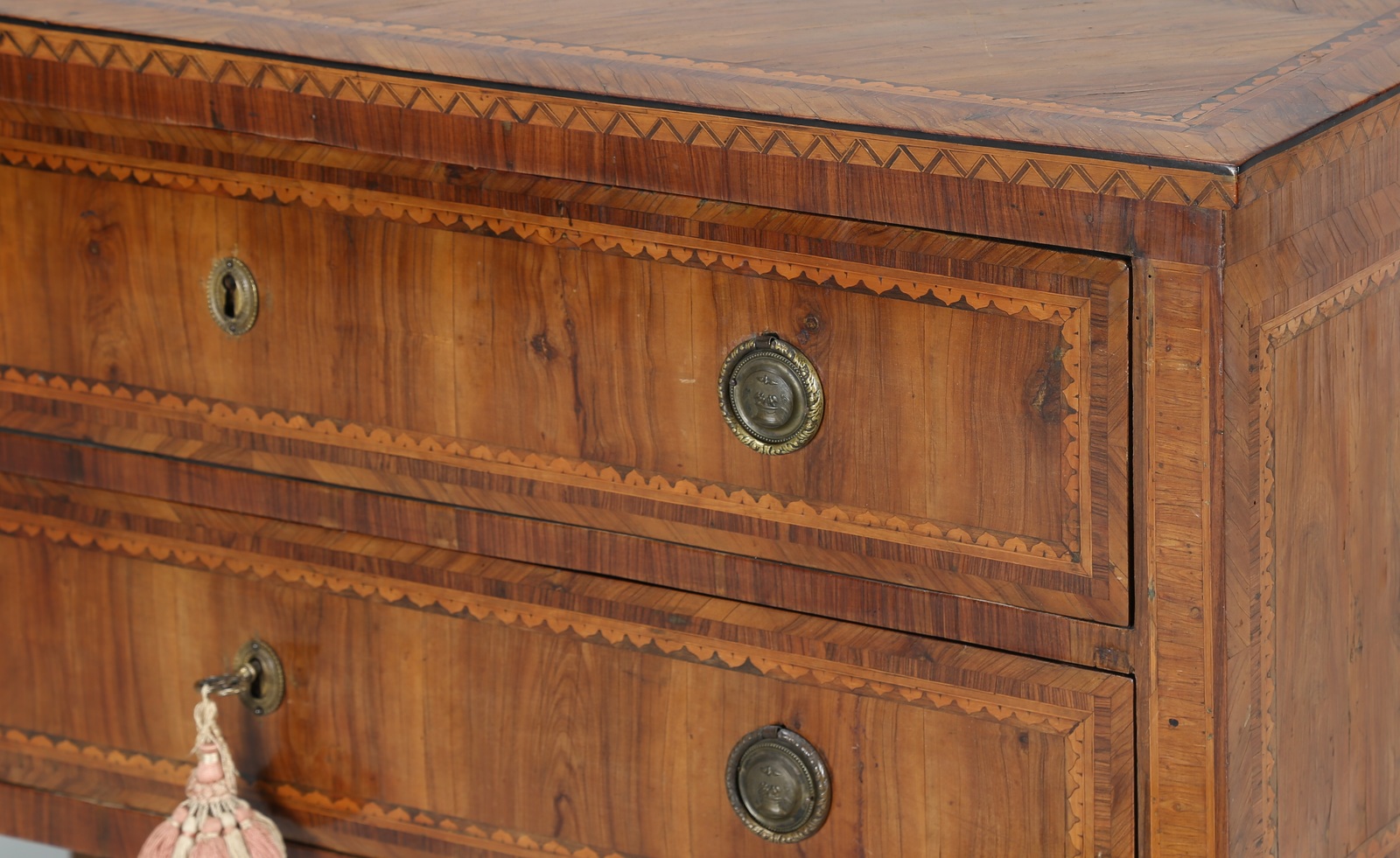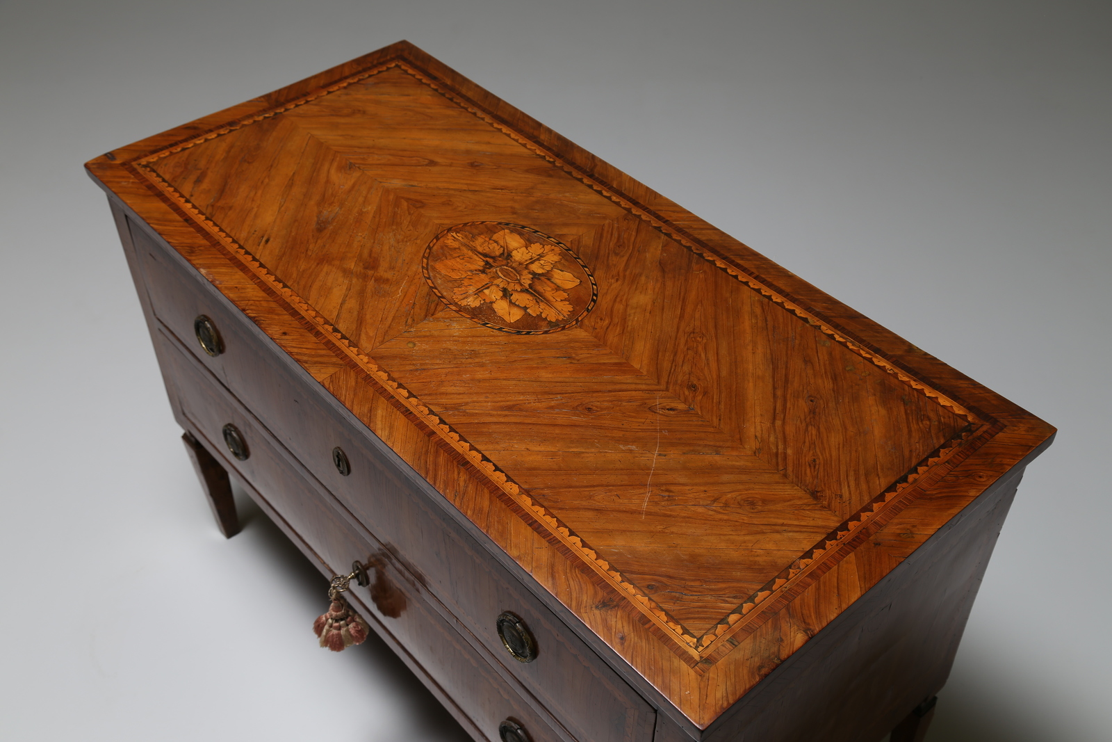 MANIFATTURA LOMBARDA DEL XVIII SECOLO Cassettone a due cassetti lastronato e intarsiato a motivi geometrici e vegetali, gambe a piramide rovesciata. . Cm 121,00 x 81,00 x 57,00. Difetti.